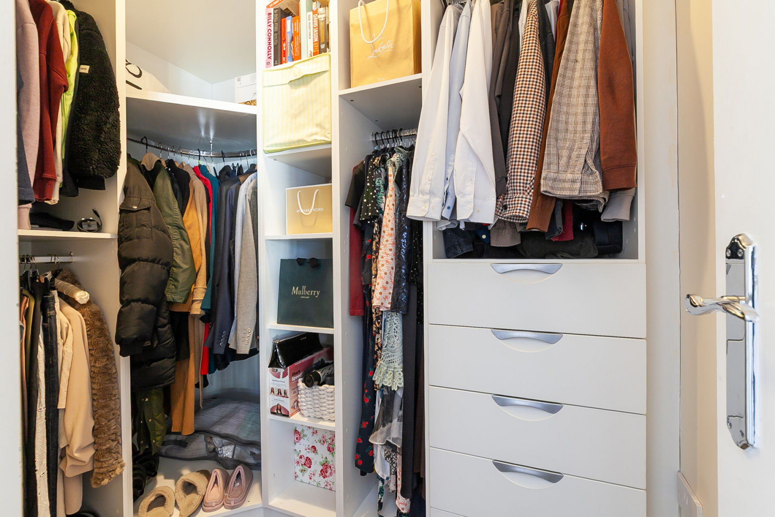 Feature fireplace (Open), picture rail, corniced ceiling and laminate wooden floor. Bespoke shelving and storage.