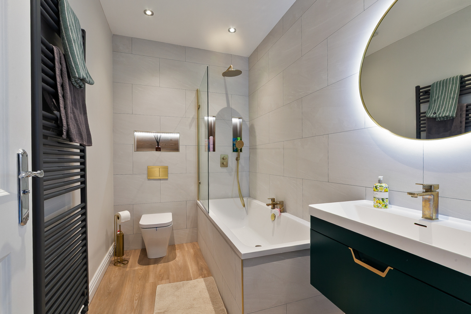 Contemporary bathroom suit comprising of paneled bath with overhead shower and glass shower screen. Mixer tap, feature inset shelving, low flush WC, heated towel rail, ceramic bowl sink unit with mixer tap and vanity storage underneath. Partly tiled walls, recessed lighting and extractor fan.