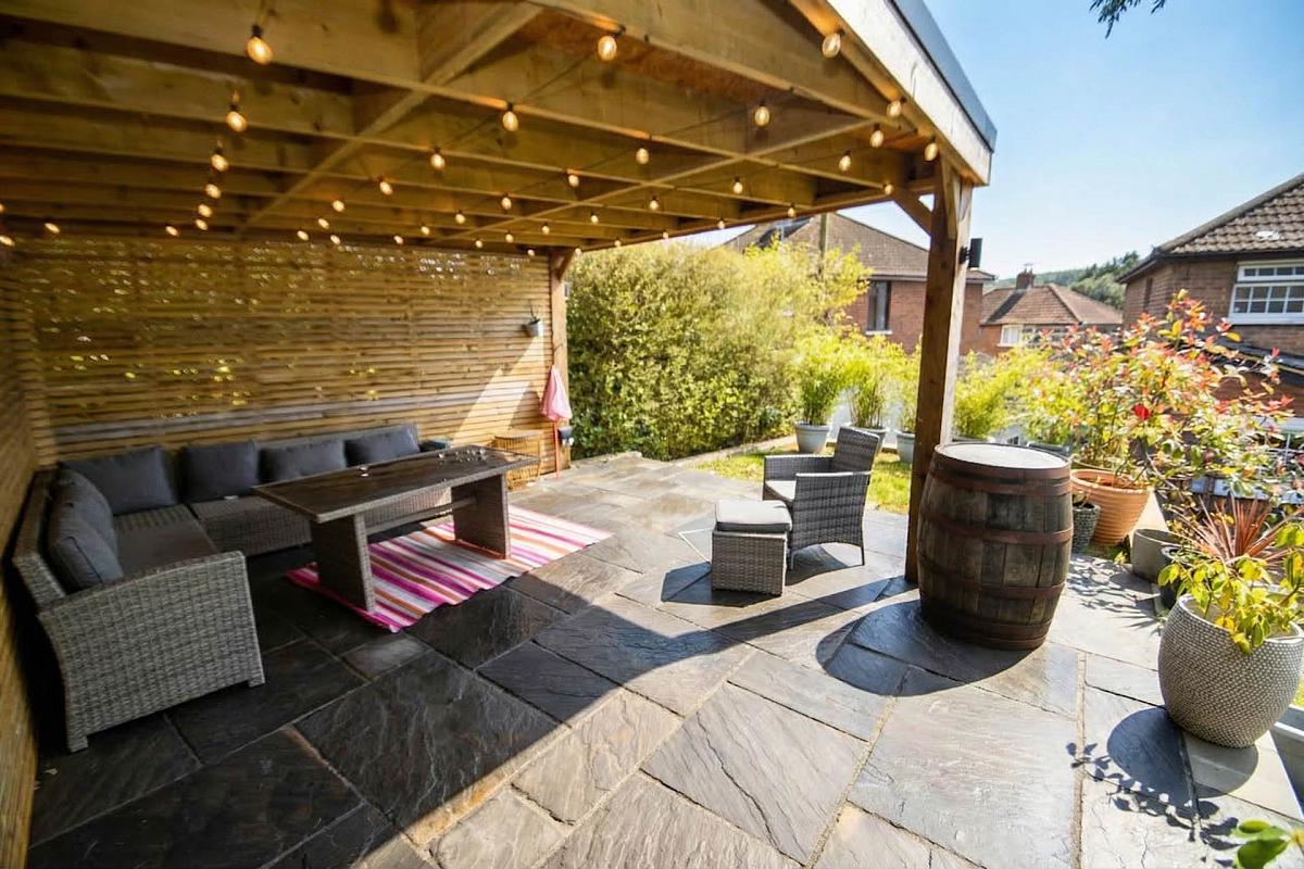Fully enclosed split level garden with easily maintained lawn & patio area, with delightful sitting area