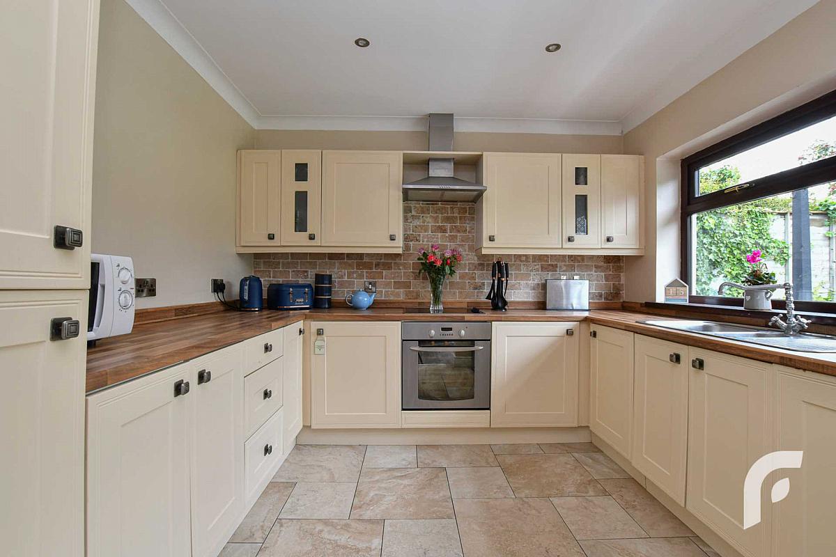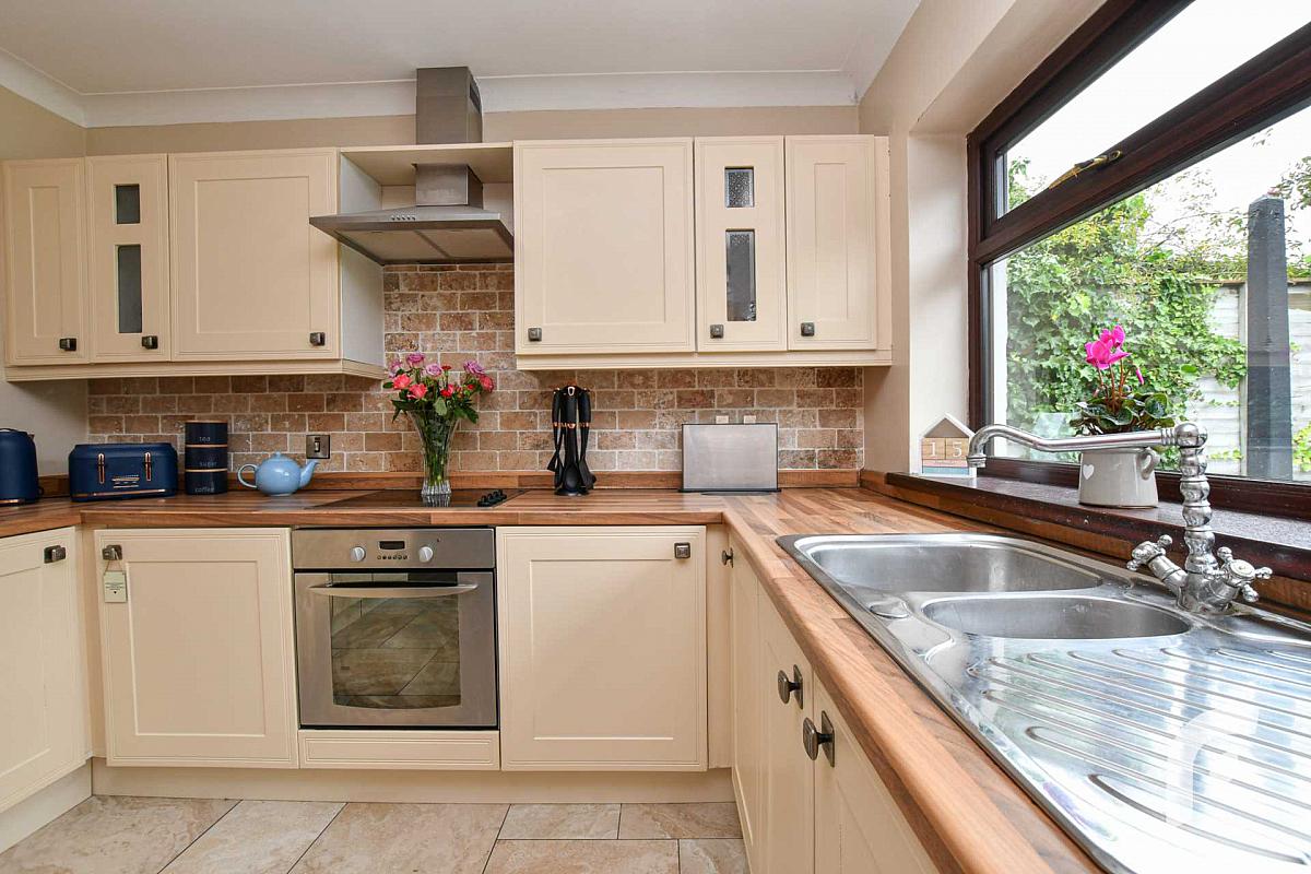 Kitchen - 9'6' x 10'1' - Modern shaker style kitchen with range of wooden units and contrasting work tops, stainless steel sink unit with mixer tap, built in appliances, electric cooker with overhead extractor fan, complemented by tiled splash back and spotlighting