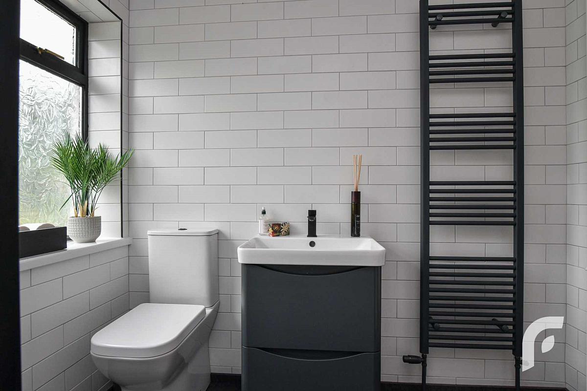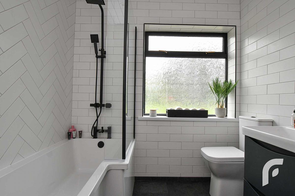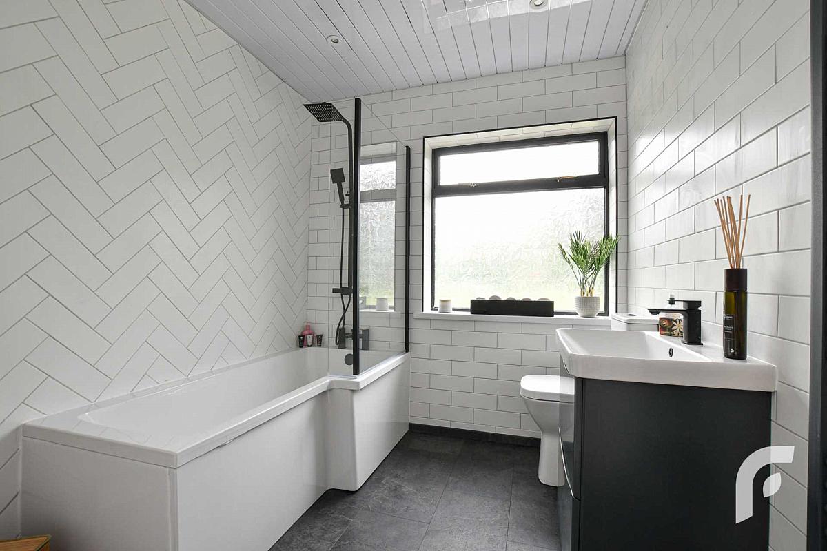 Bathroom - 7'9' x 7'2' - Contemporary white three piece suite including bath with shower, low flush WC and wash hand basin with storage unit, complemented by tiling, panelling and feature radiator