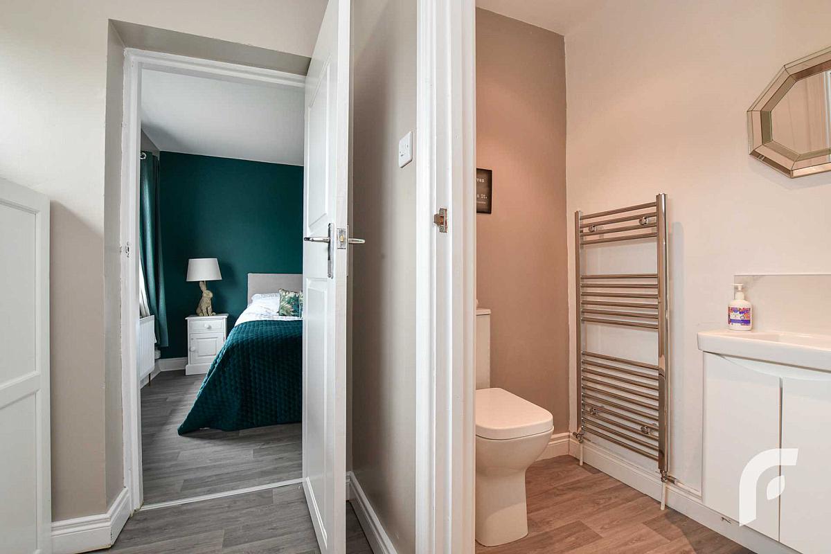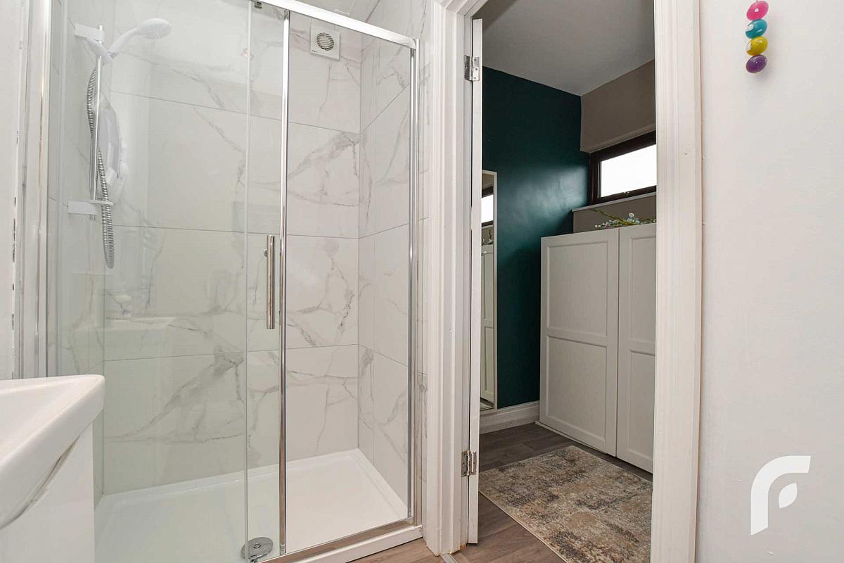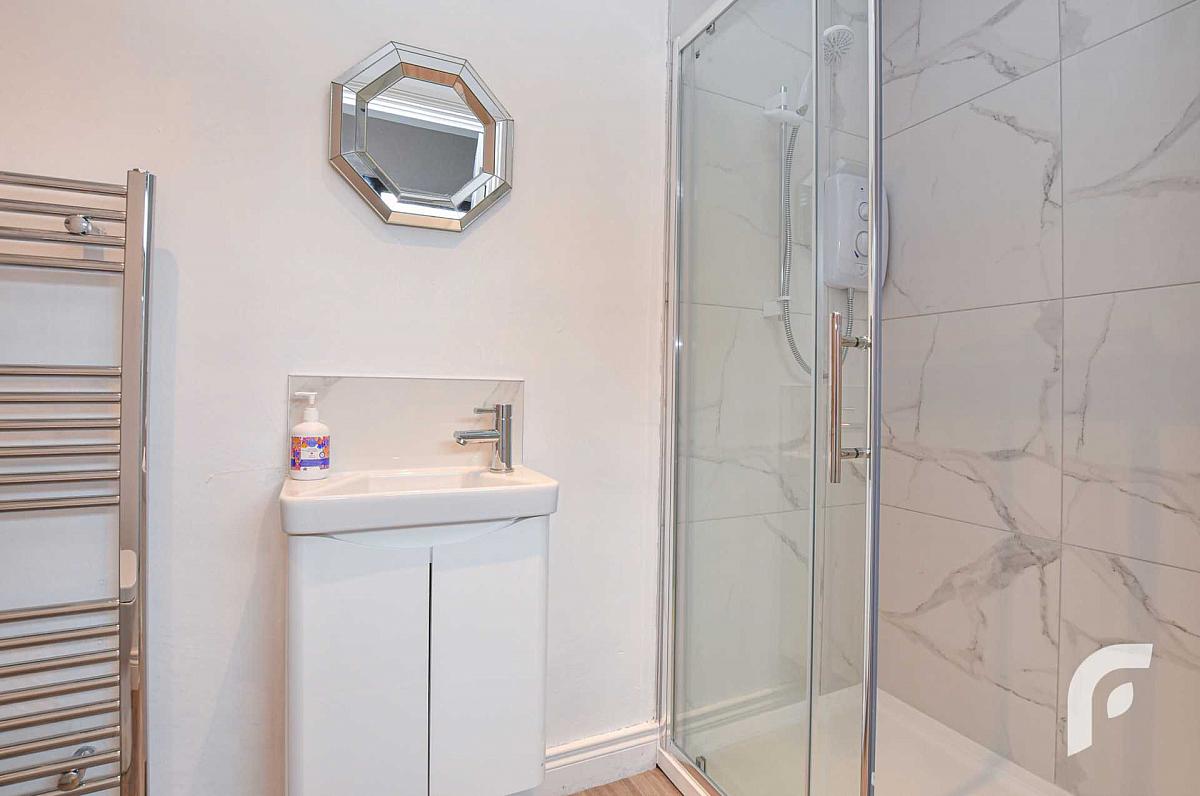 Ensuite - 3'9' x 8'4' - White three piece suite including walk in shower, low flush WC and wash hand basin, with feature chrome towel rail.