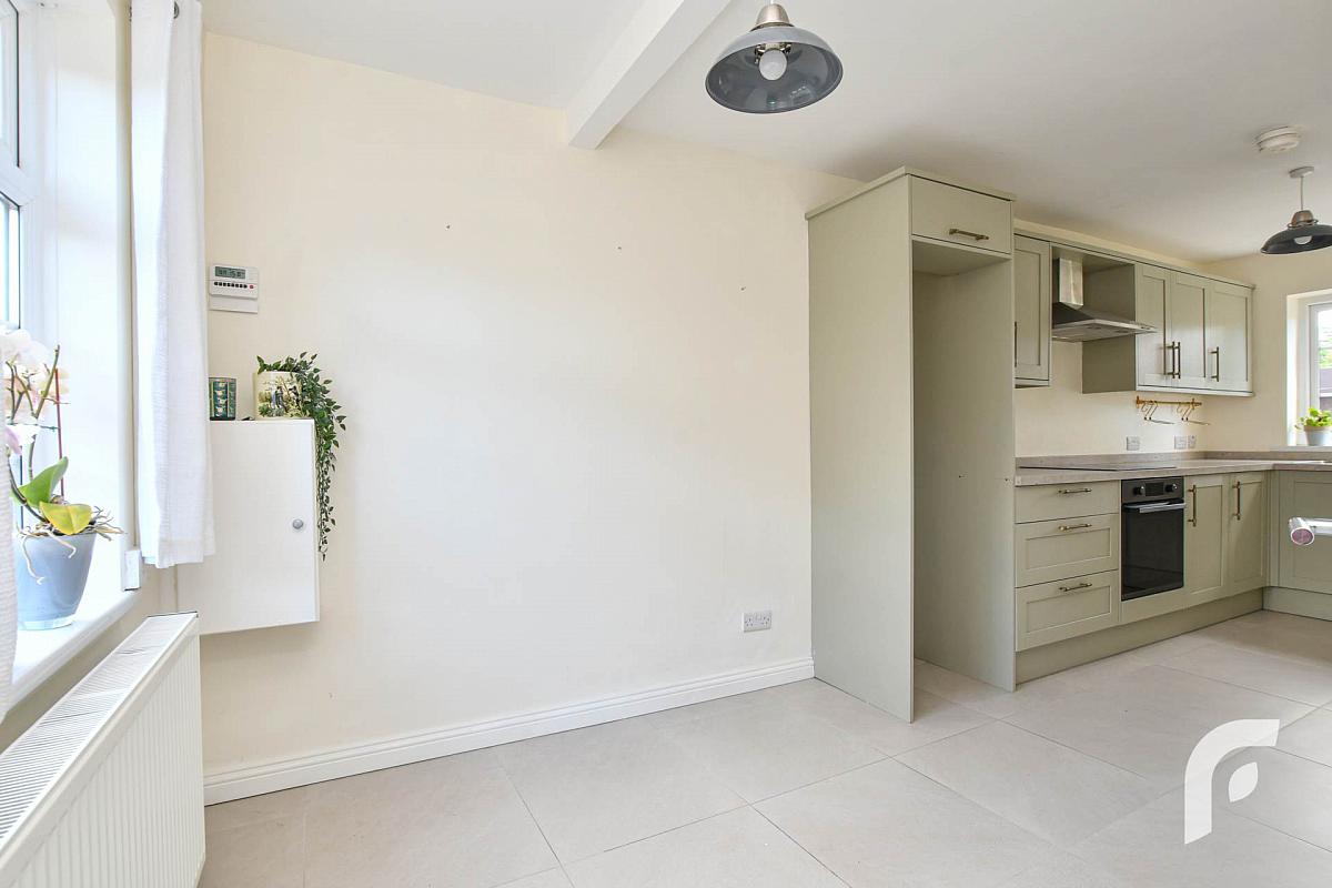 Kitchen - 20'2' x 11'2' - new with modern sage green wooden units, contrasting worktops, space for essential appliances, stainless steel sink with mixer tap, porcelain flooring.