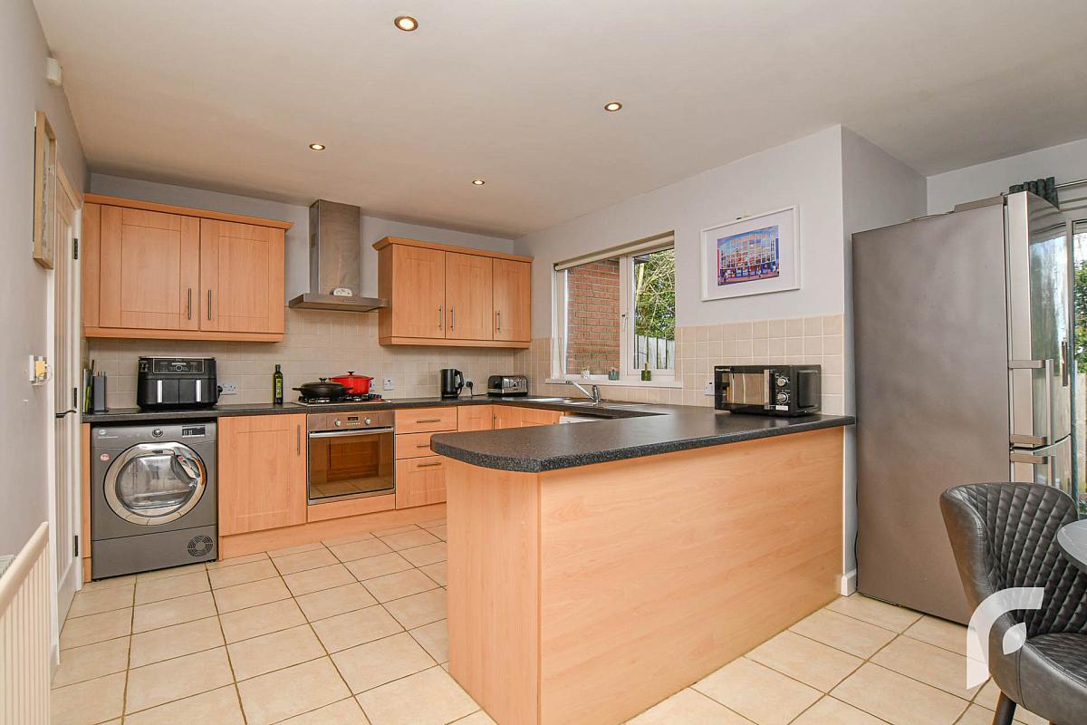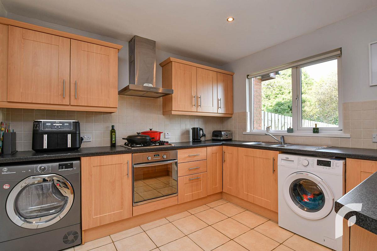 Kitchen - 14'5' x 20' - good range of high and low-level wooden units, oven/grill, gas hob, stainless steel extractor fan, stainless steel sink with mixer tap and draining bay, space/plumbing for washing machine and tumble dryer, tiled flooring.