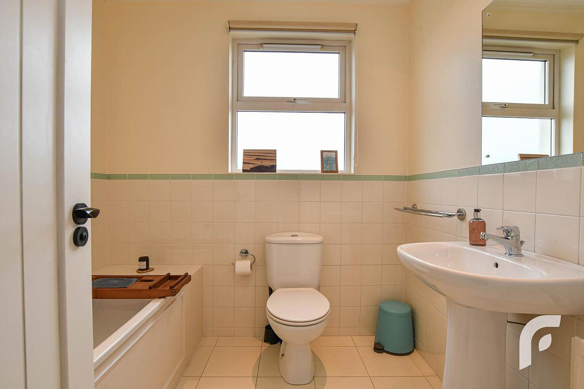 Bathroom - 6'7' x 7' - three piece white suite with bath, tiled flooring.
