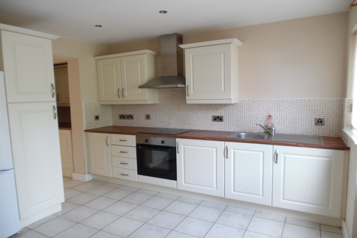 Full range of high and low level modern fitted units, matching work tops, built-in under oven, 4 ring ceramic hob unit, fridge/freezer, extractor fan, single drainer stainless steel sink unit, tiled floor. Additional area with fitted units.