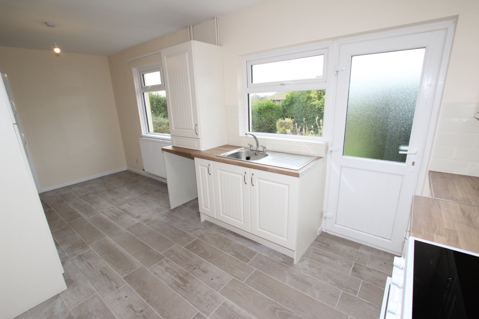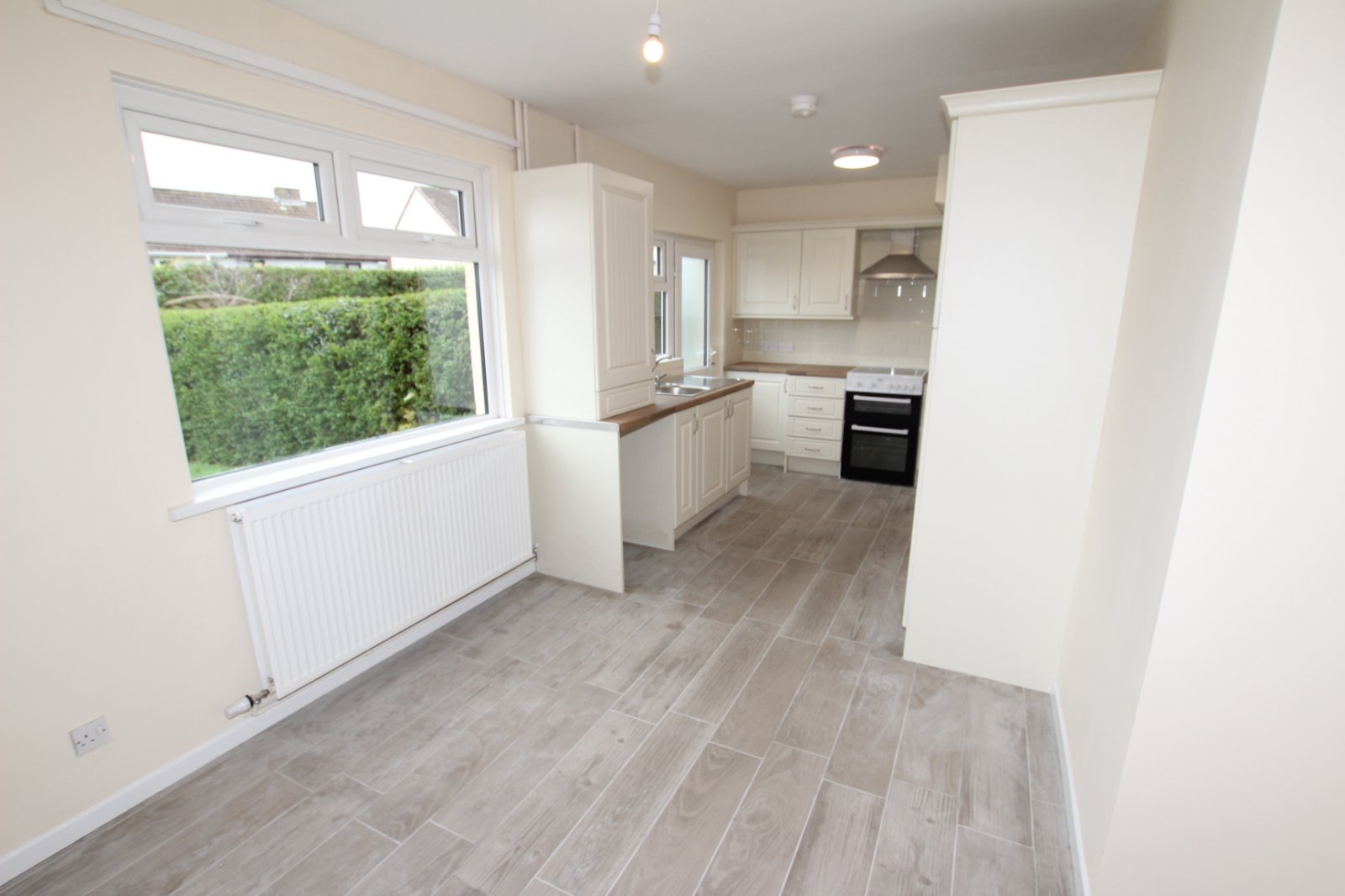 Brand new modern kitchen comprising a range of high and low level shaker units with matching work surfaces, stainless steel sink and drainer unit, completed with free standing cooker and space for electrical appliances.