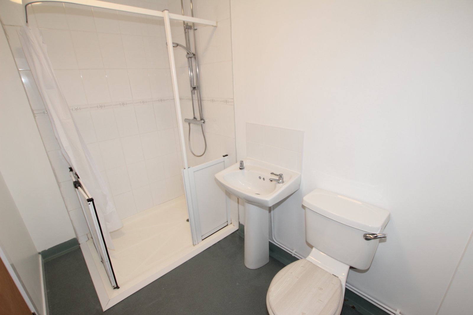 Dual flush Wc, pedestal wash hand basin and walk in shower.