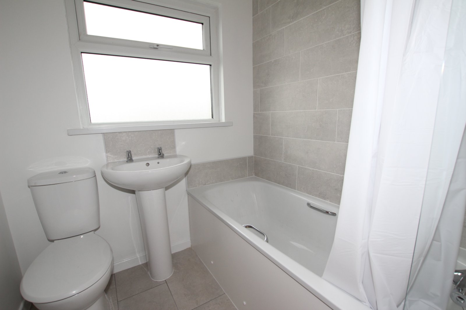 Brand new contemporary bathroom suite comprising ceramic tiled flooring and splashbacks, panelled bath with overhead shower, dual flush WC and pedestal wash hand basin.