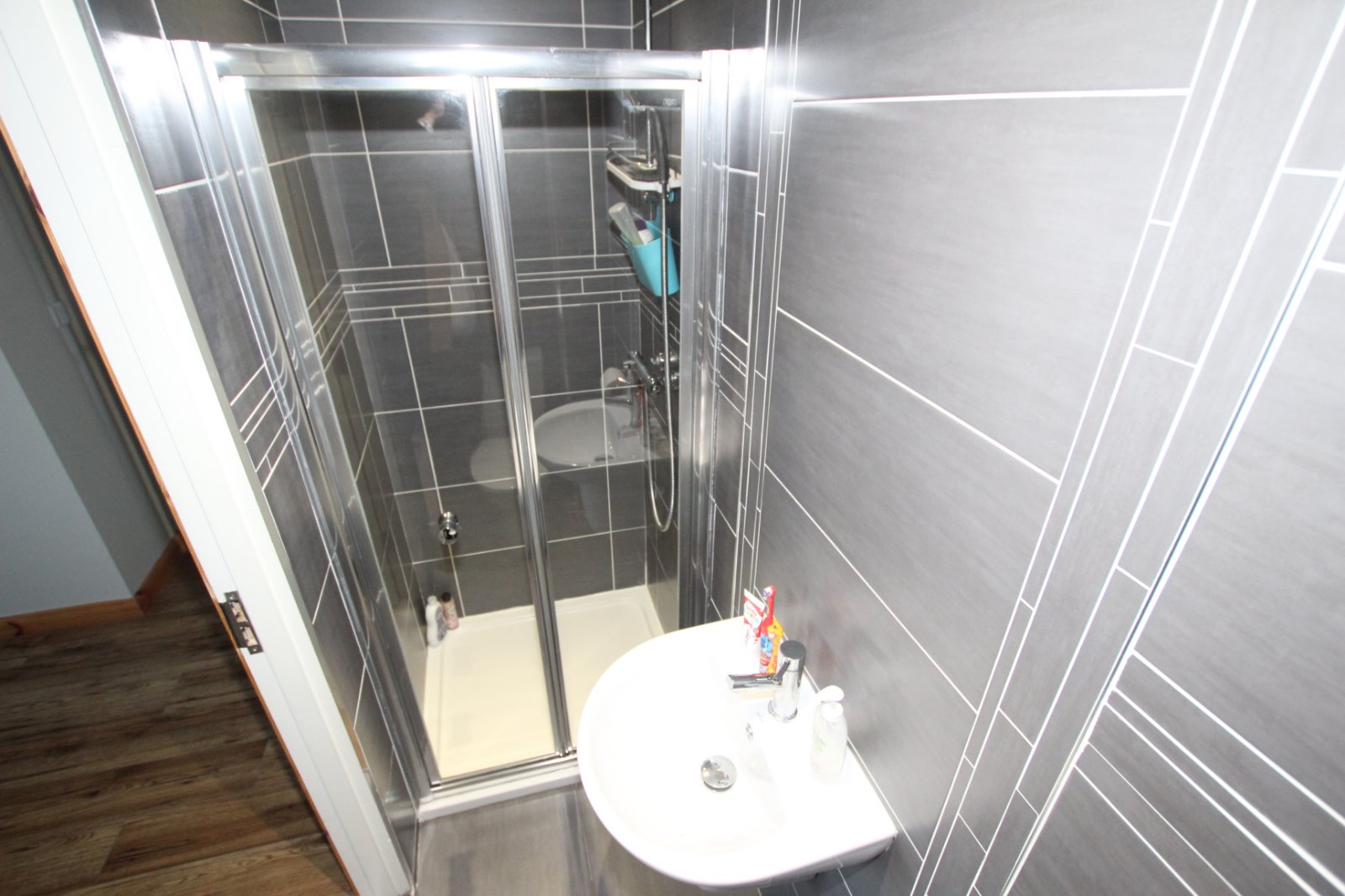 Contemporary white three piece suite comprising fully tiled shower enclosure, semi pedestal wash hand basin and WC. Thermostatic controlled mains shower.