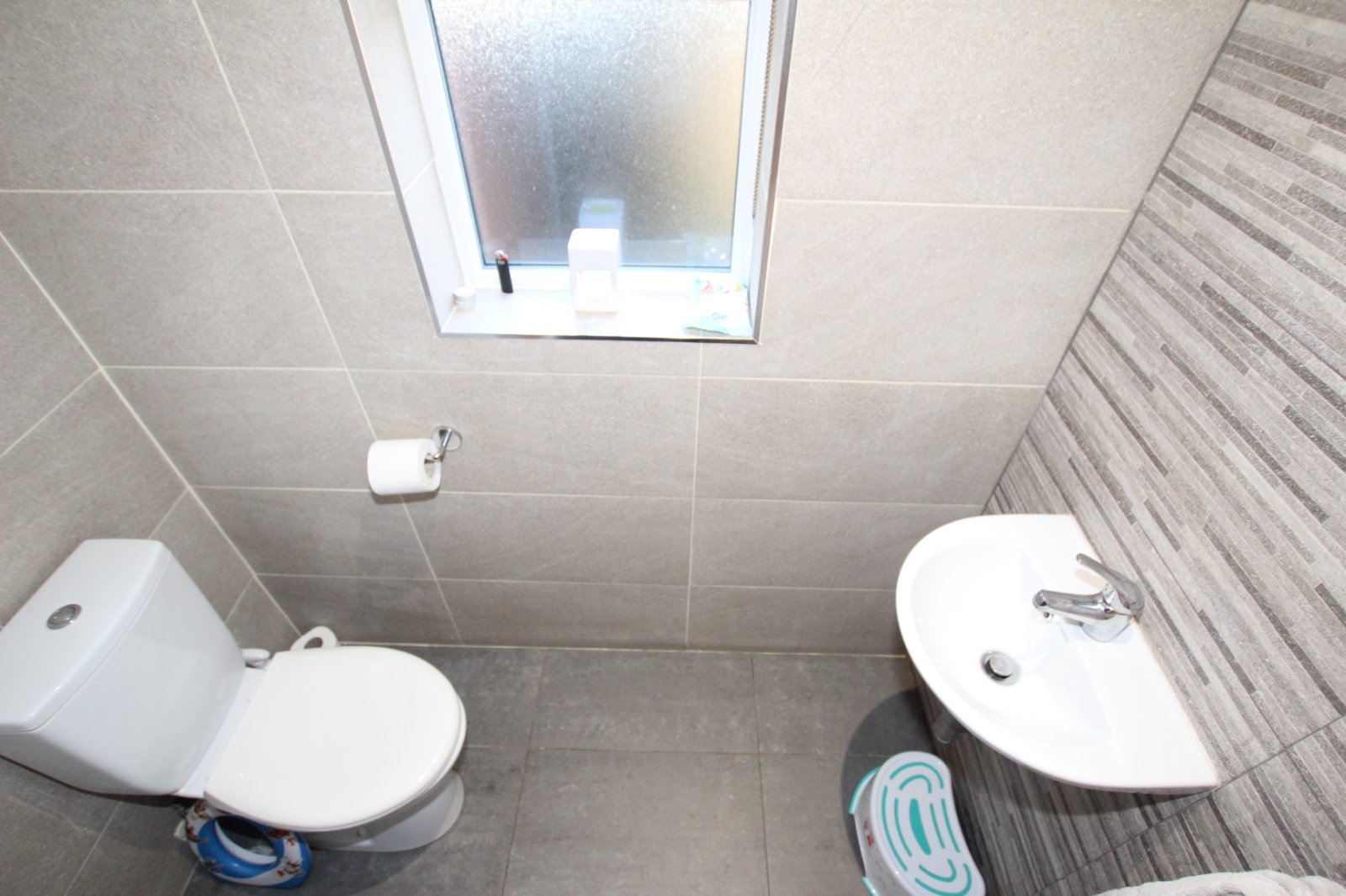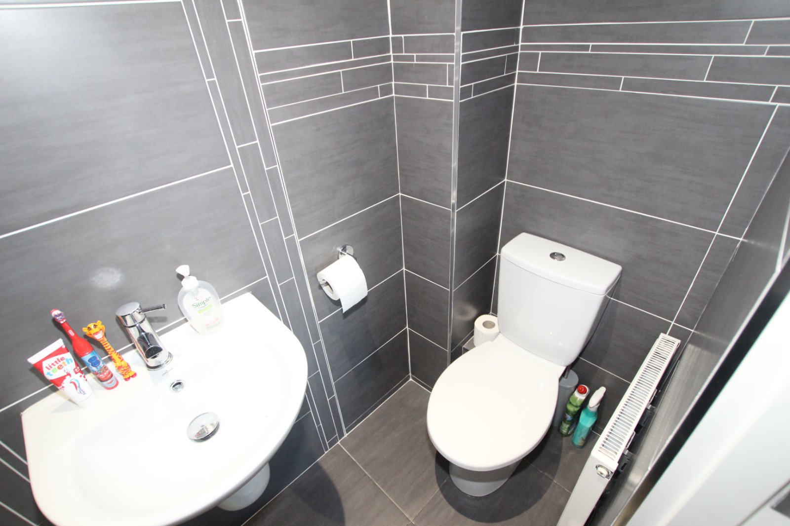 Ceramic tiled walls and flooring, dual flush WC and pedestal wash hand basin.