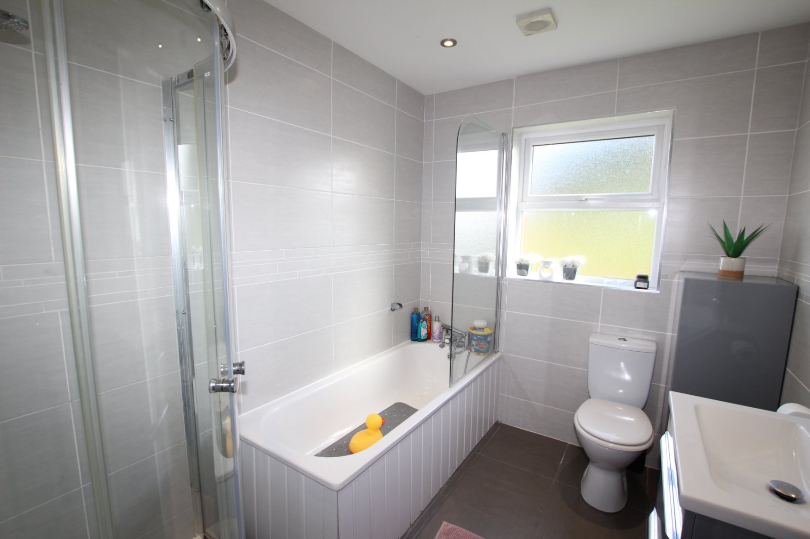 White four piece suite comprising panelled bath, pedestal wash hand basin, corner shower cubicle and WC. Tiling to walls. anthracite towel radiator. Tiled floor.
