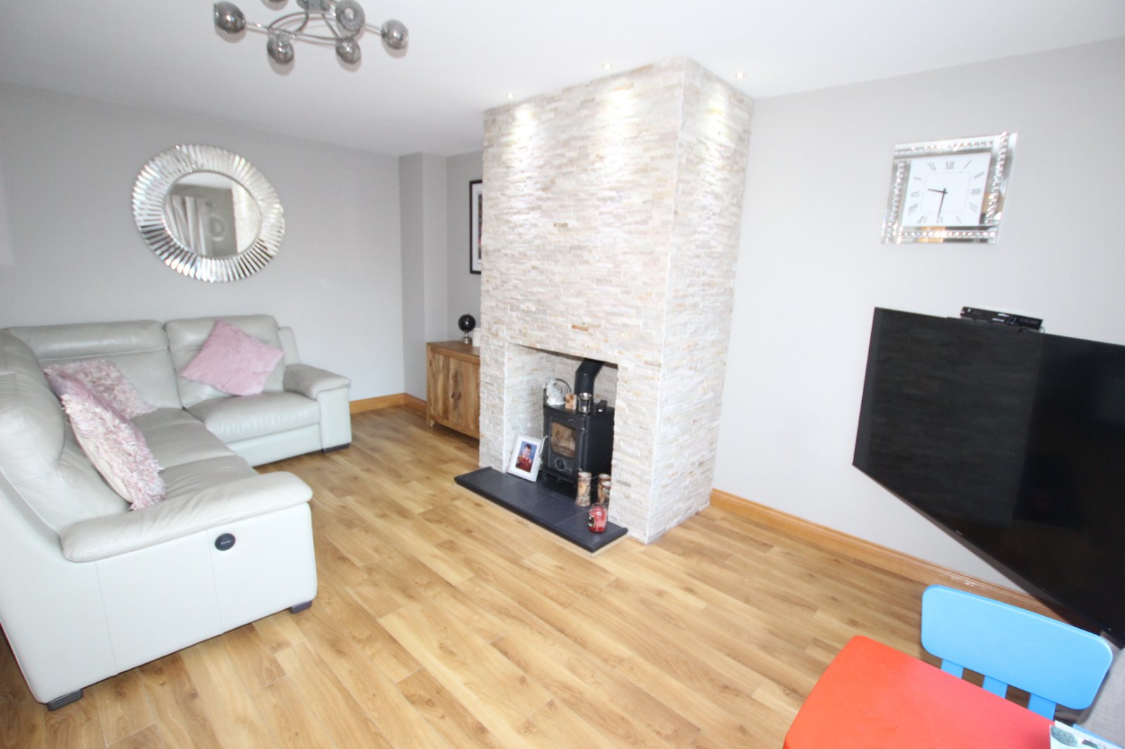 Bright and spacious living area, hardwood flooring, inset fireplace complete with slate tiling and multi fuel burning stove.