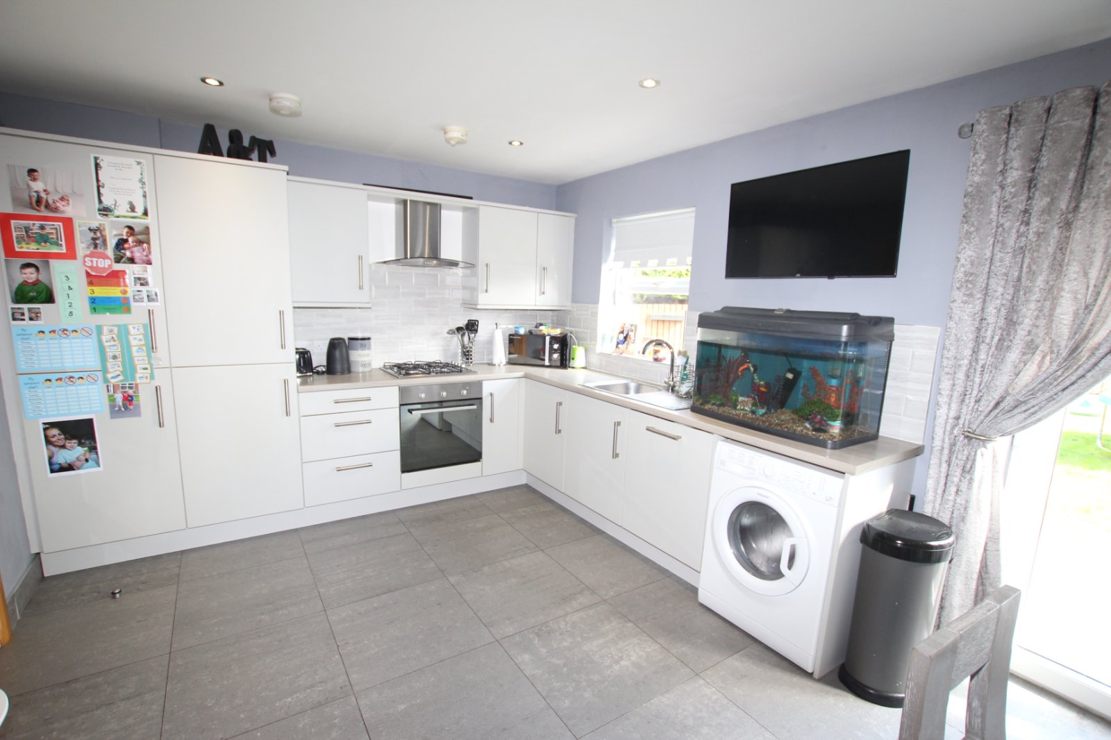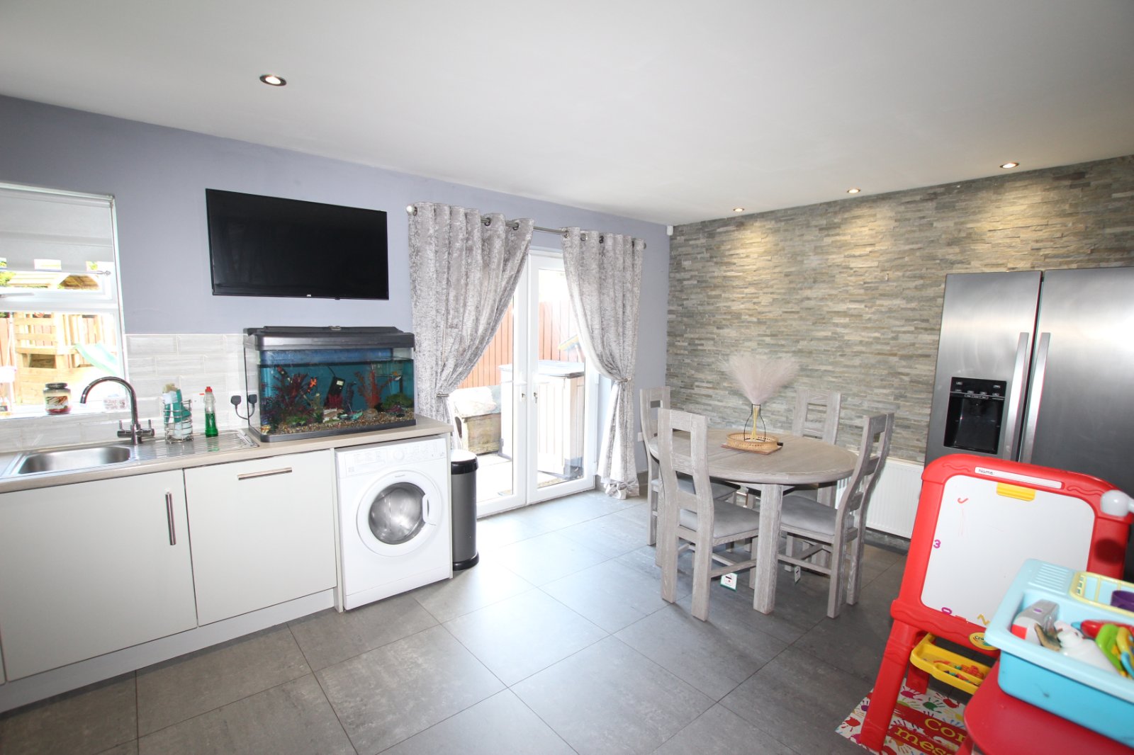 Modern fitted kitchen with range of high and low level units and matching worktop surfaces. Stainless steel sink with ingrained draining bay. Built in gas hob with stainless steel extractor hood over. Built in oven. Integrated appliances to include dishwasher and washing machine. Tiled splashback areas. Tiled floor. Low voltage spotlights. Open to Ample casual dining space complete with tiled flooring. Double glazed door to rear garden.