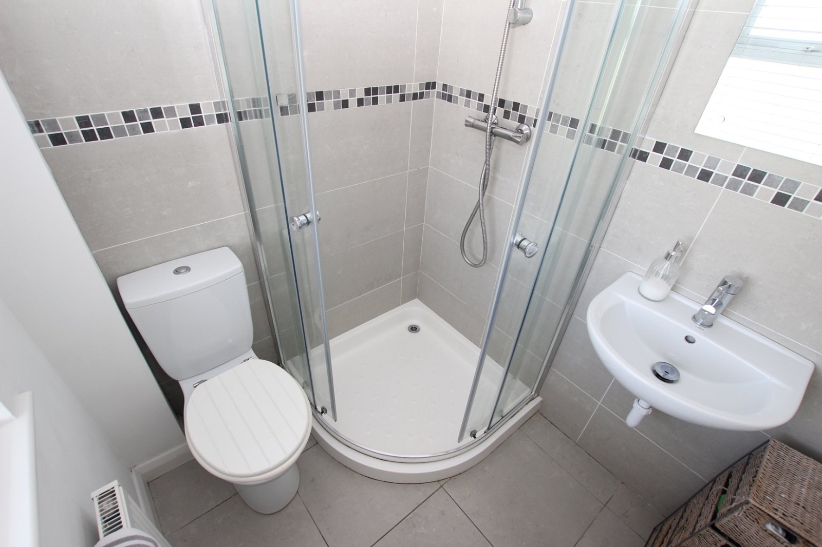 Enclosed corner shower unit with glass shower screen. Ceramic bowl sink with mixer taps. Low flush WC, tiled floor and extractor fan.