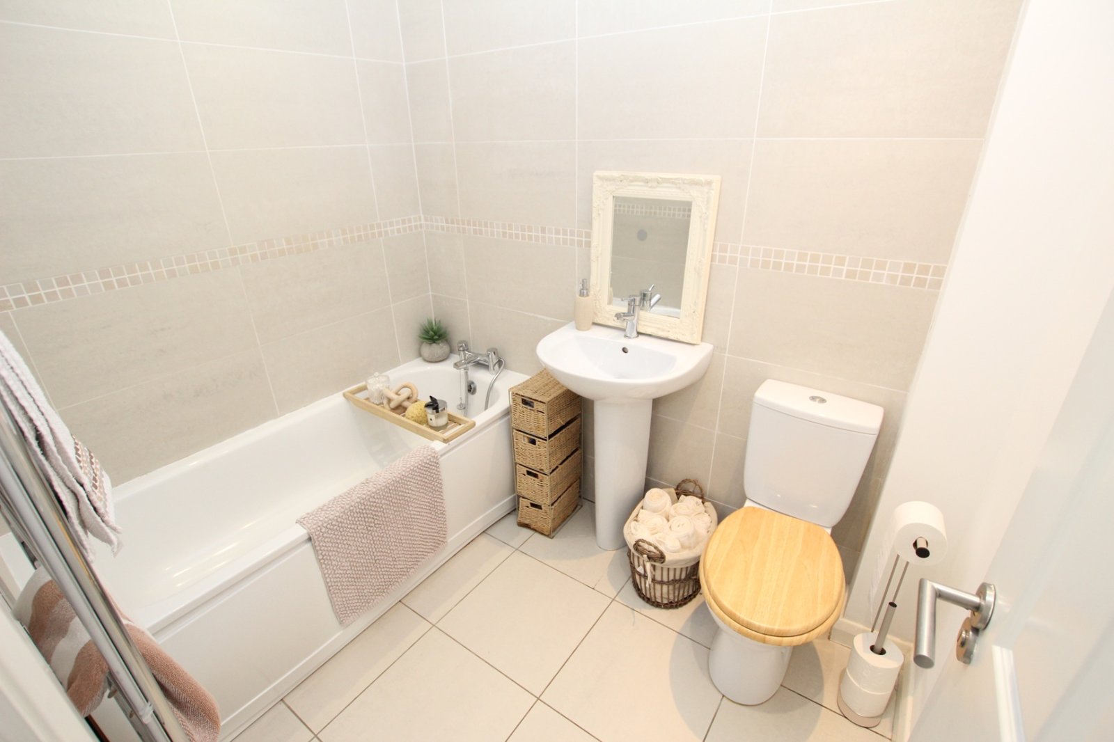 Three piece bathroom suite comprising panel bath with mains shower overhead. White pedestal wash hand basin with low flush WC. Large chrome heated towel rial. Tiled walls and tiled flooring.