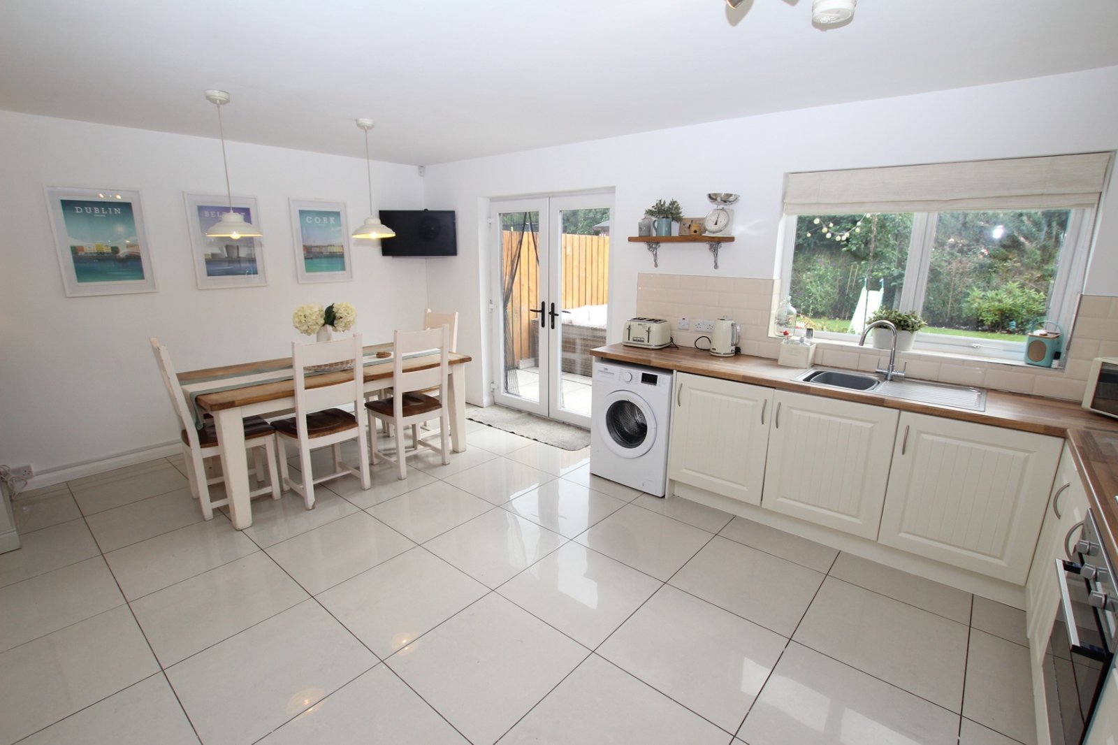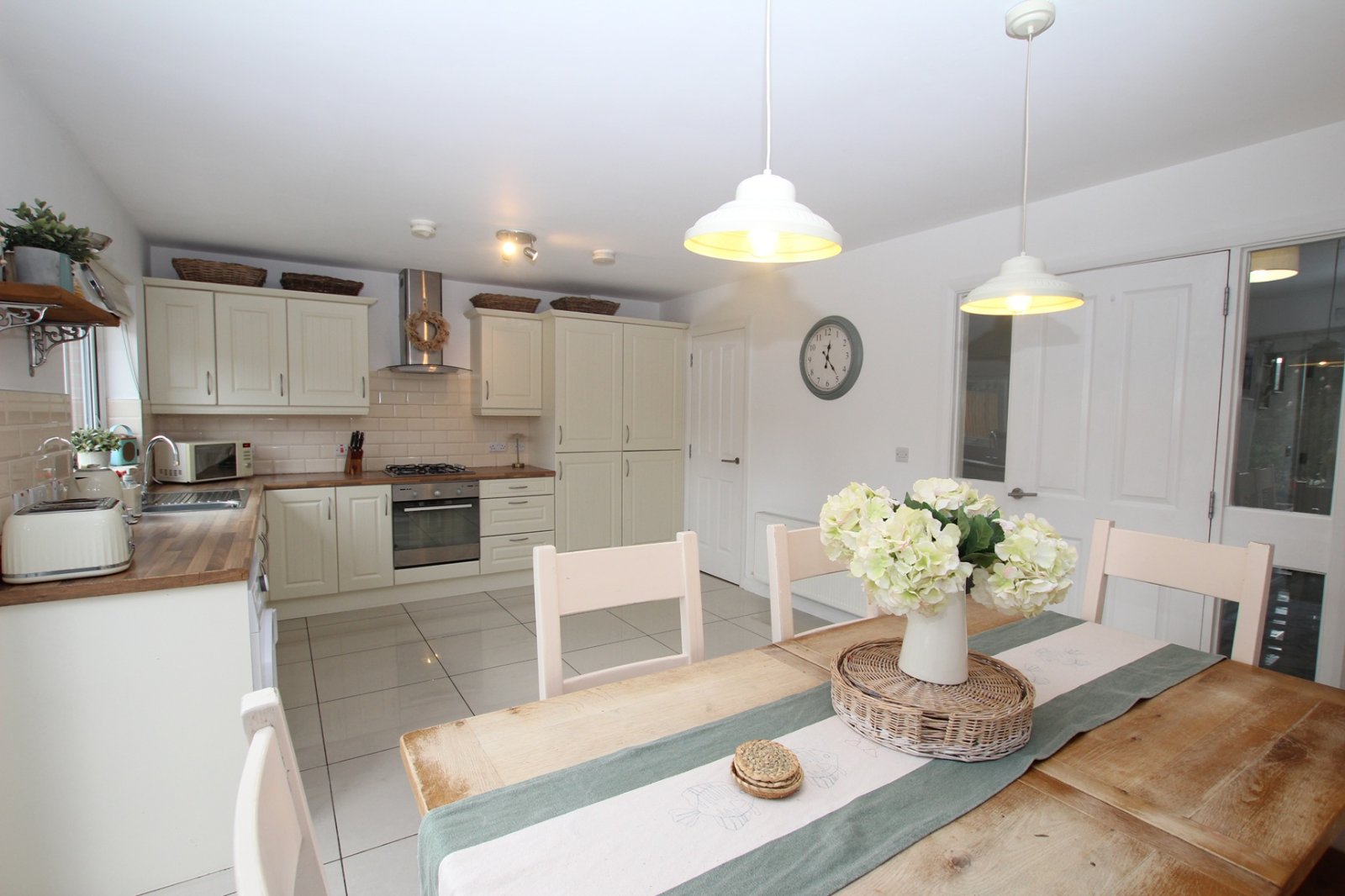 Excellent range of high and low level units with matching worktop surfaces. Stainless steel sink with ingrained draining bay and chrome mixer tap. Built in gas hob with stainless steel extractor hood over. Built in oven. Integrated fridge freezer and dishwasher Plumbed for white good appliances. Tiled splashback areas. Tiled floor. Low voltage spotlights. Open to Ample casual dining space complete with tiled flooring. Double glazed door to rear garden.