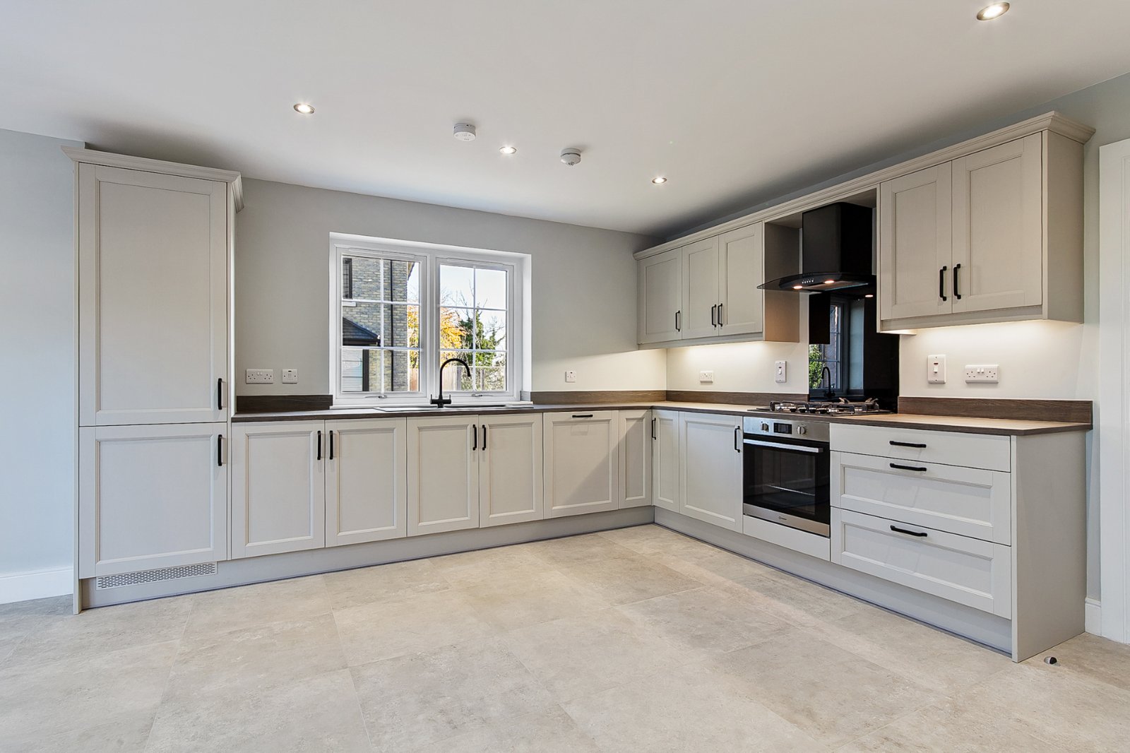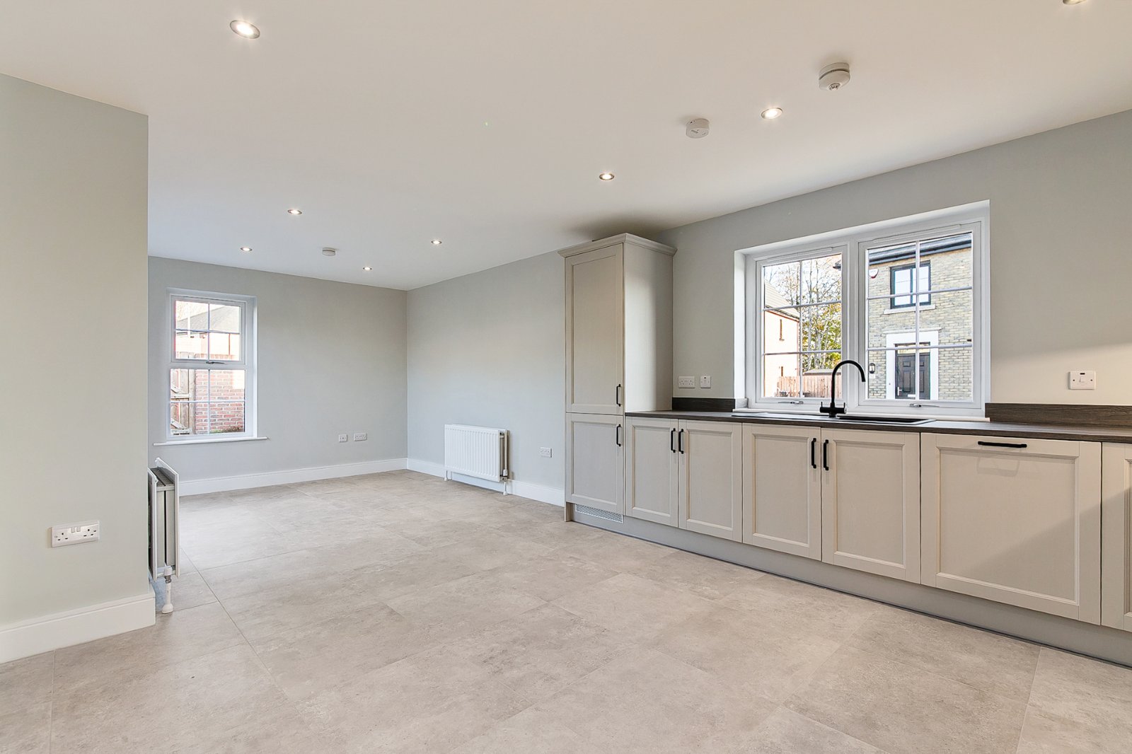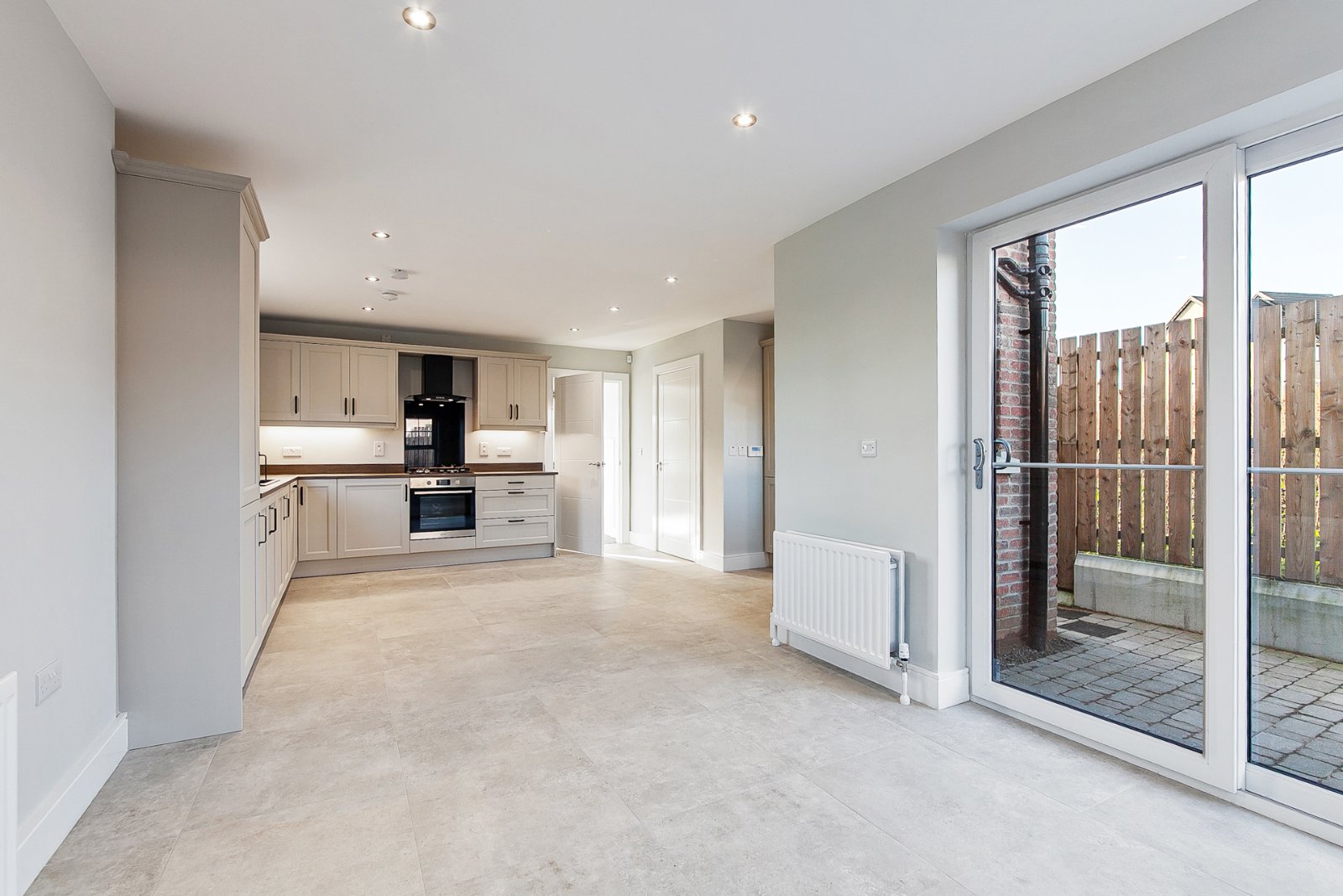 Excellent range of high and low level units with matching worktop surfaces. Black composite sink with black mixer tap. Built in electric oven with gas hob and extractor fan overhead. Integrated appliances to include fridge freezer and dishwasher. Open plan aspect offering ample casual dining space. Finished with tiled flooring and recessed spotlights.