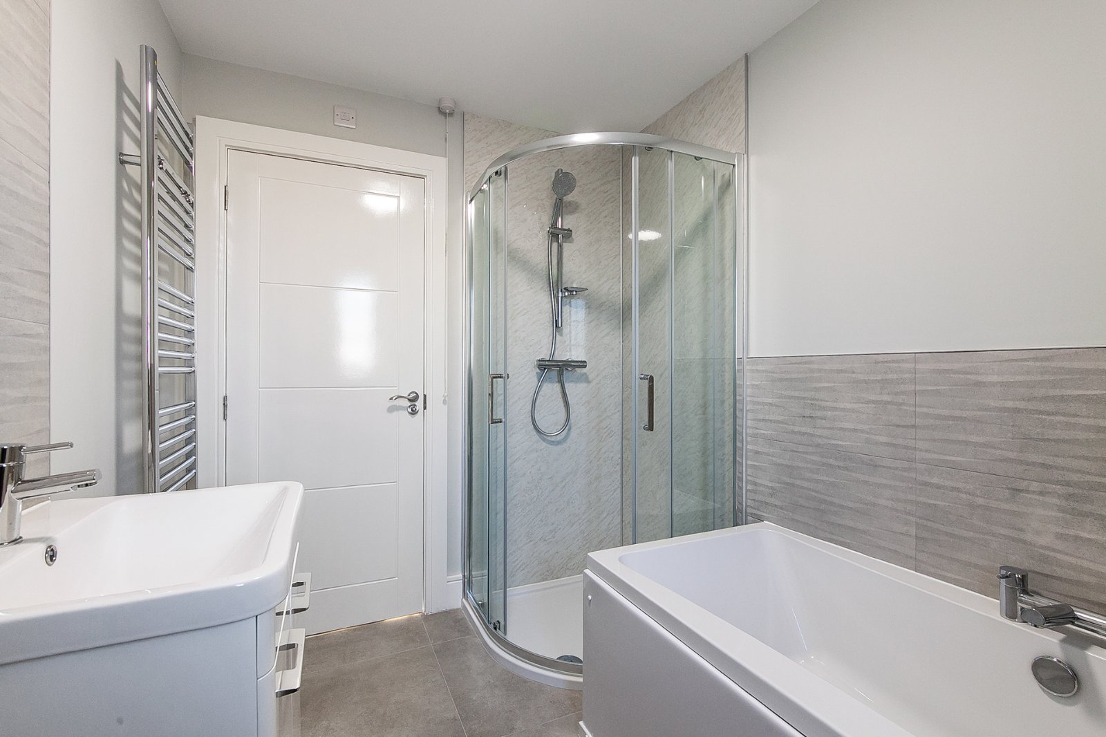 Stylish four piece bathroom suite comprising panel bath with front facing mixer tap. Separate walk in shower cubicle with mains thermostatic shower. Sink with vanity unit beneath. Large chrome heated towel rail. Tiled flooring and tiled splashback areas. Extractor fan.