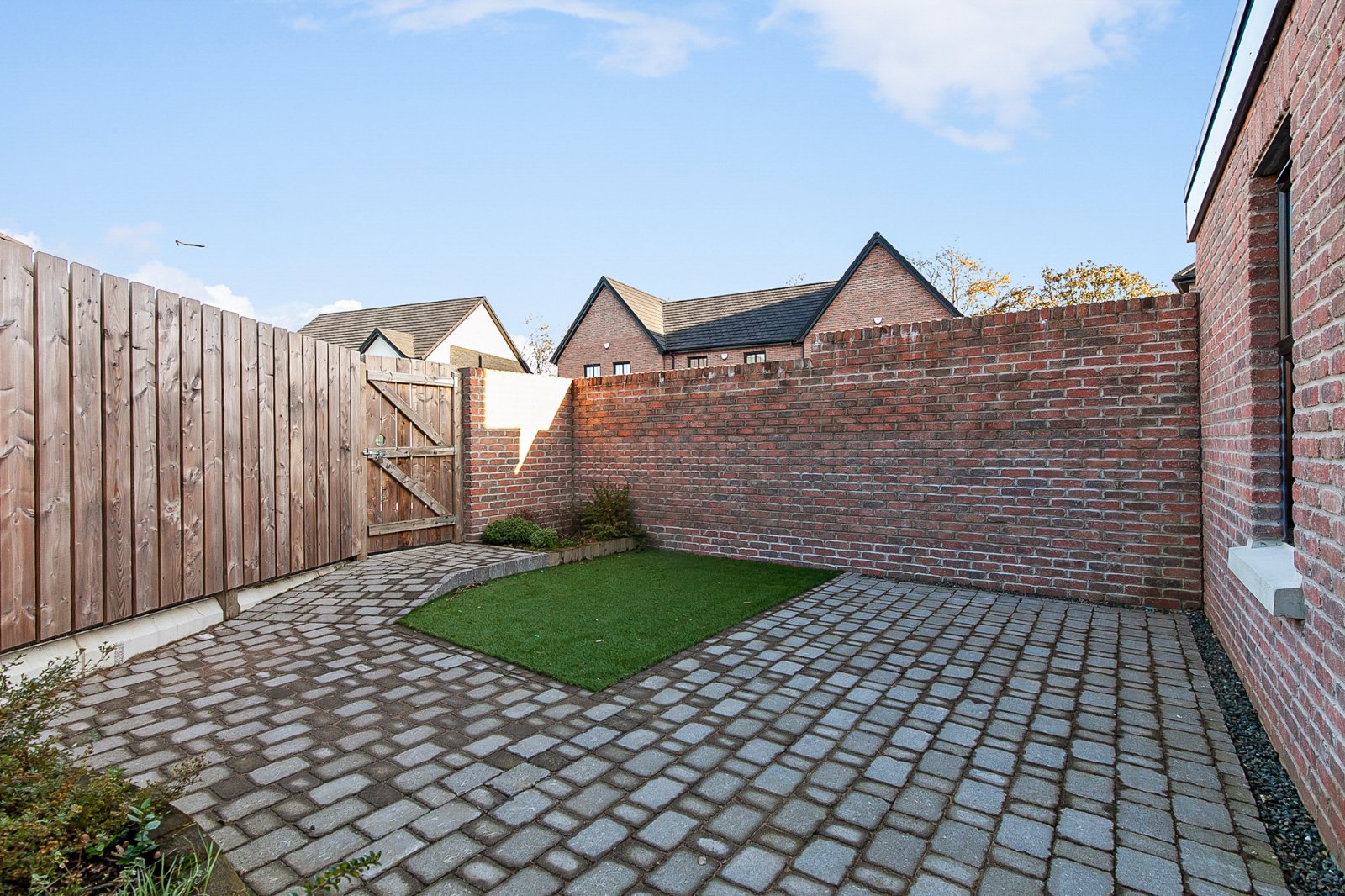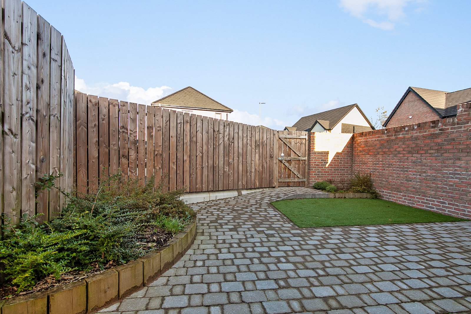 Low maintenance rear garden complete with block paving and artificial grass area.