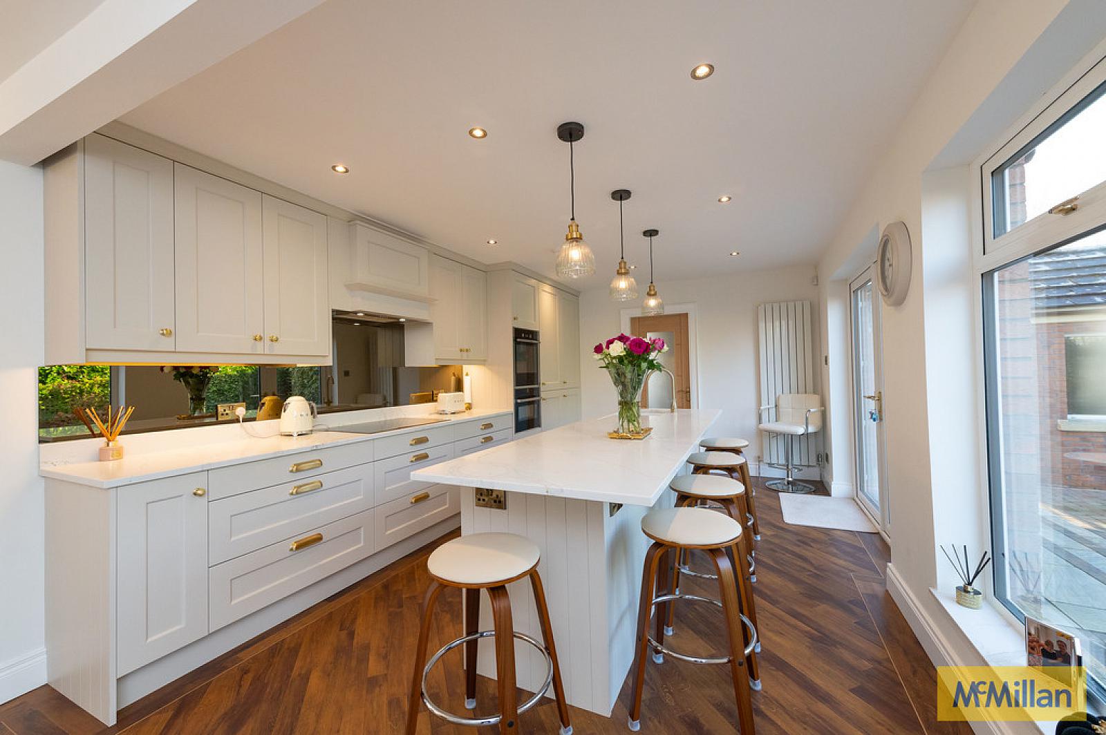 Luxury hand painted kitchen with island, casual lounge/dining area and quartz work surfaces