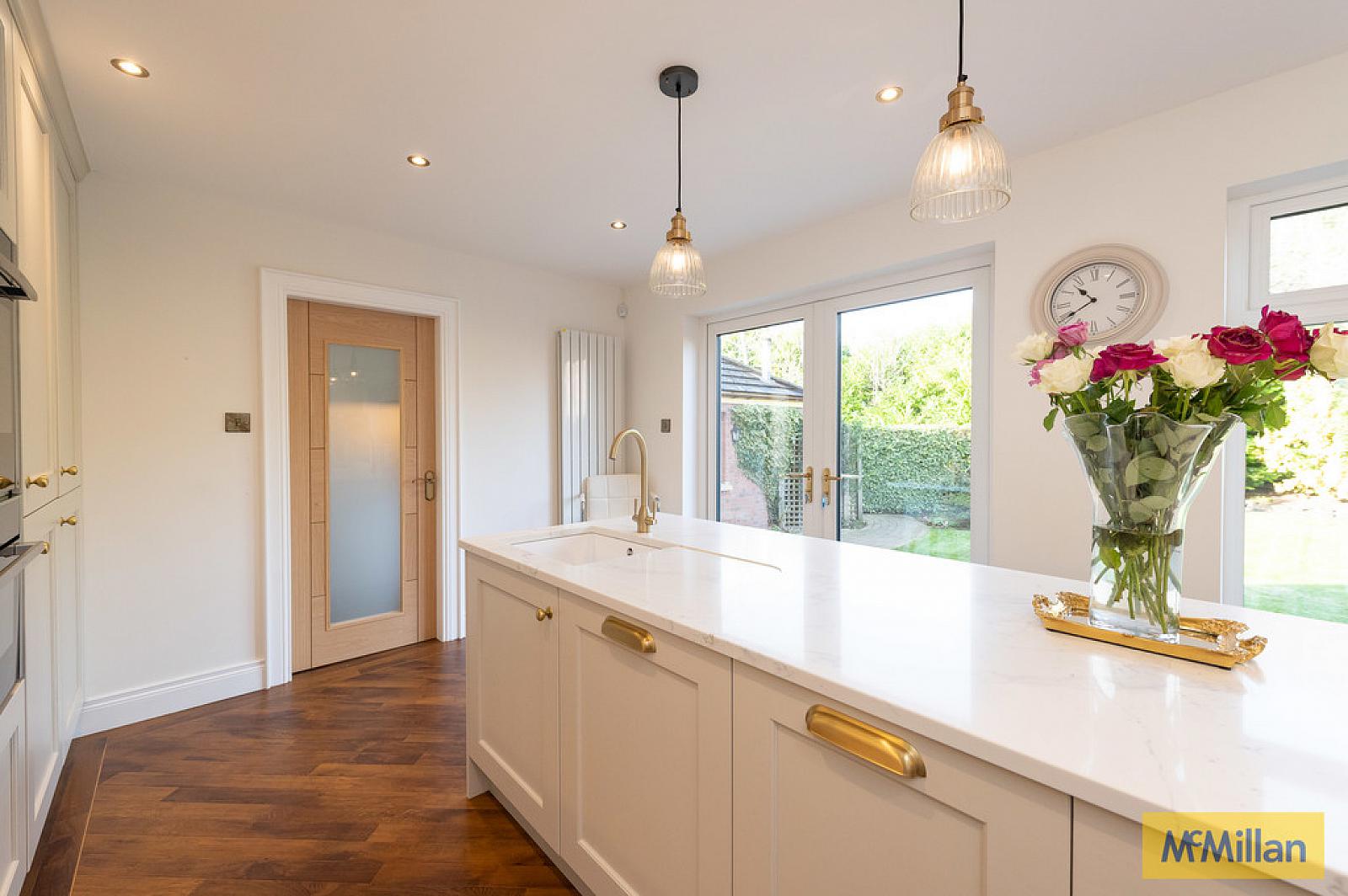 KITCHEN 15' 9" x 11' 2" (4.8m x 3.4m) Luxury fitted hand painted kitchen with range of high and low level units, quartz work surfaces with upstands, built in Neff five ring induction hob, integrated Neff double oven, extractor fan, built in integrated full size fridge, built in Neff microwave oven, integrated Neff dishwasher, downlighters, mirrored splashback, island with casual dining area, wired for flatscreen, island with built in sink with mixer taps and quartz drawer, French doors to rear