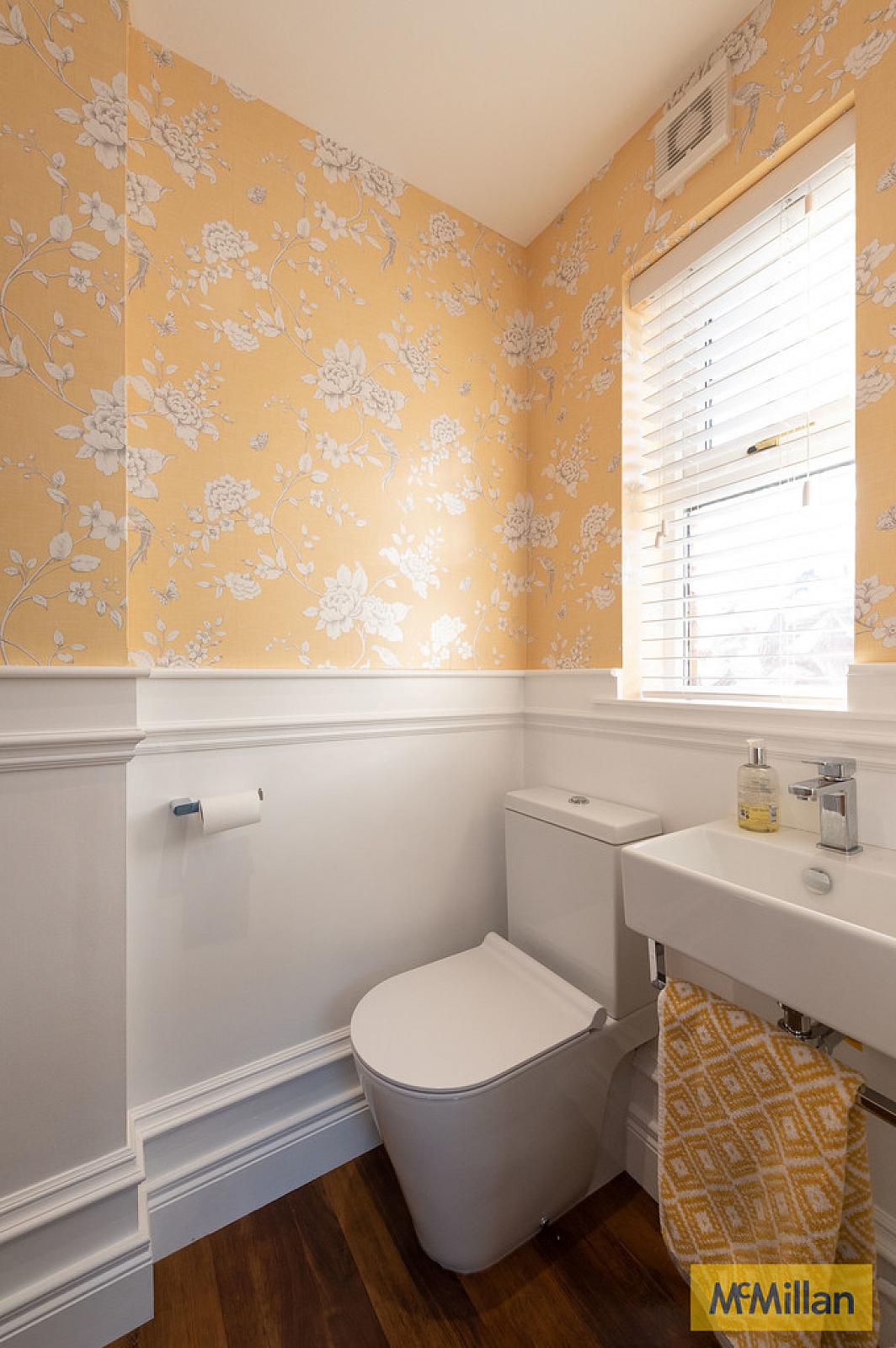 CLOAKS Low flush WC, wall tiling, wash hand basin, panelling