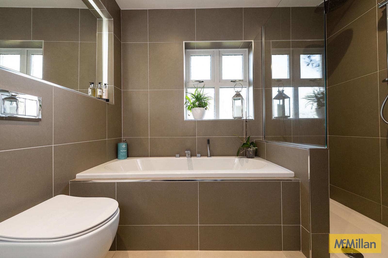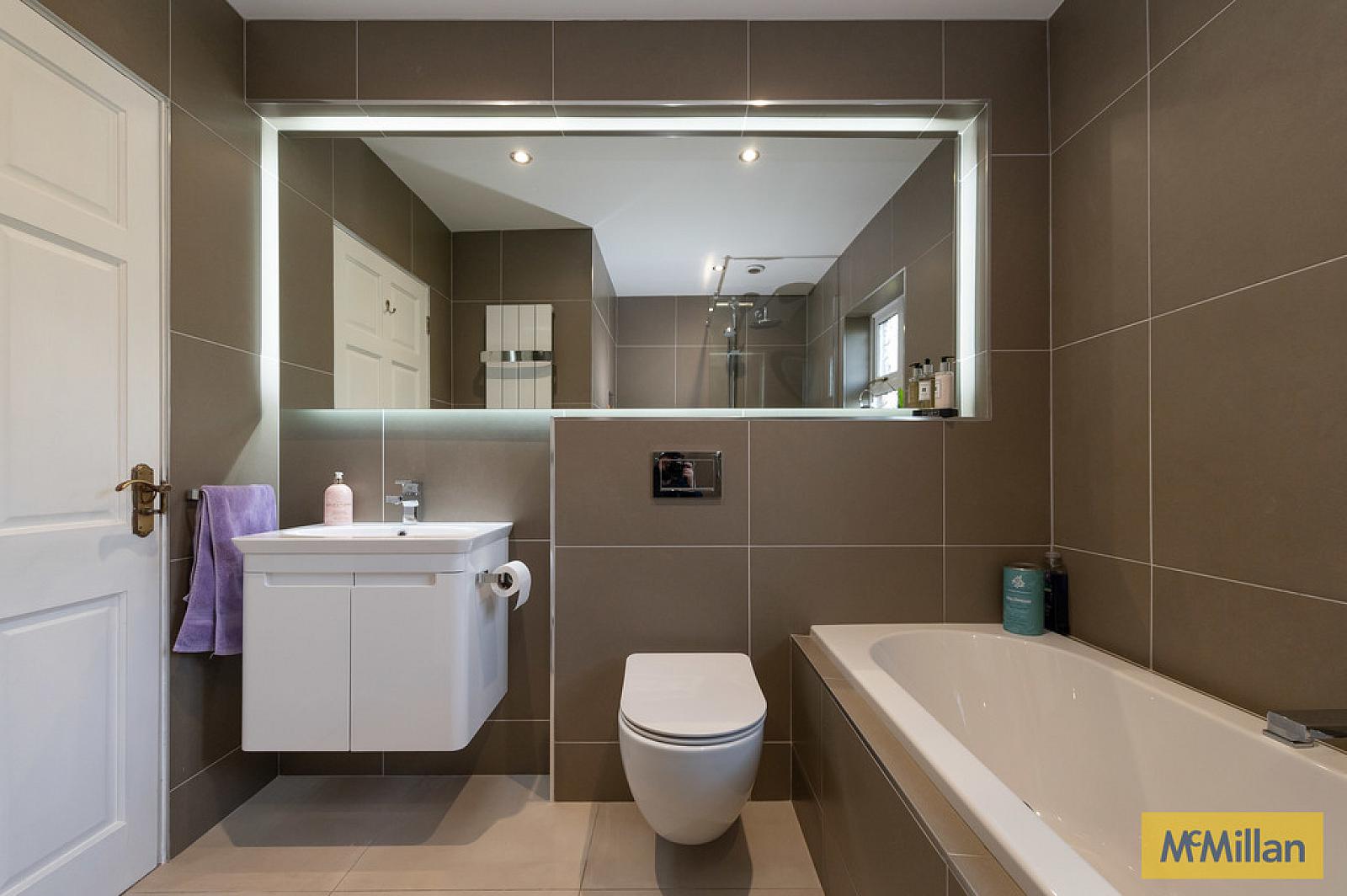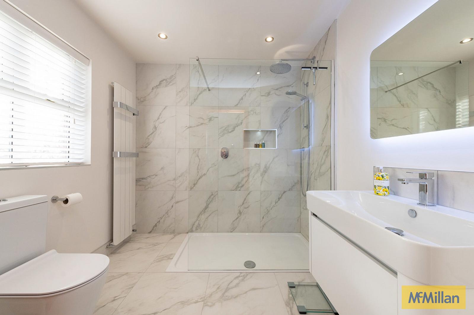 LUXURY BATHROOM Luxury white bathroom suite, built in bath with mixer taps and hand shower, vanity unit, wall hung WC, walk in shower unit with controlled shower and rain shower, attractive luxury tiling, Cosy Toes heated flooring, built in mirror with lights