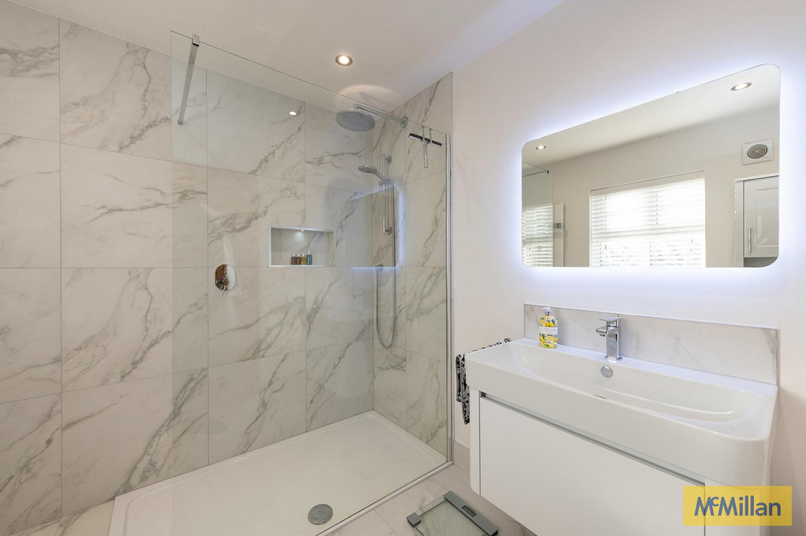 LUXURY SHOWER ROOM Low flush WC, wall hung wash hand basin, wall in shower unit with controlled shower plus rain shower attachment, luxury tiling, Cosy Toes heated flooring, built in mirror with lights, downlighters