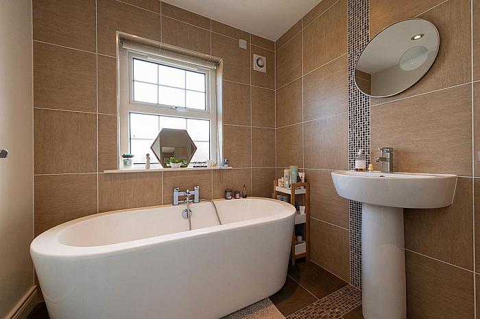 WHITE BATHROOM SUITE Low flush WC, roll top bath with mixer tap, pedestal wash hand basin, luxury tiling, ceramic tile flooring, downlighters