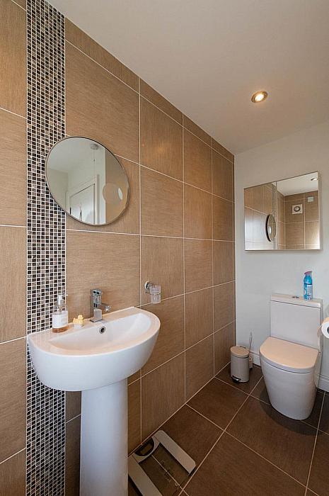 ENSUITE Low flush WC, wash hand basin, corner glazed shower unit with controlled shower, tiling, ceramic tiled flooring, view