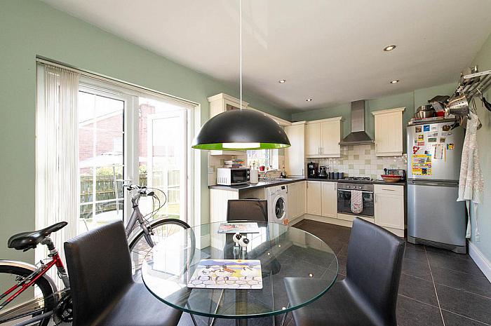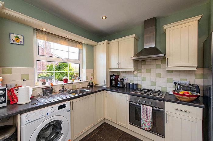 KITCHEN 16' 11" x 9' 6" (5.16m x 2.9m) Modern fitted kitchen with range of high and low level units, round edge worksurfaces, stainless steel sink unit with mixer taps, built in gas hob, built in fan assisted oven, stainless steel extractor fan, tiling, gas boiler, plumbed for washing machine, ceramic tiled flooring, French doors to rear