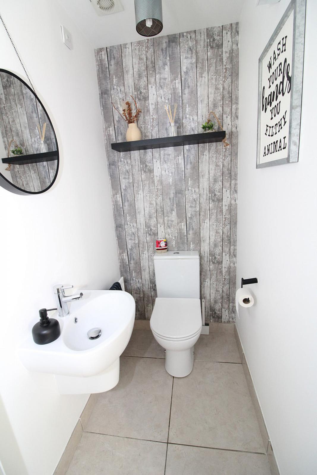 CLOAKS Low flush W.C, half pedestal wash hand basin, ceramic tile floor, extractor fan