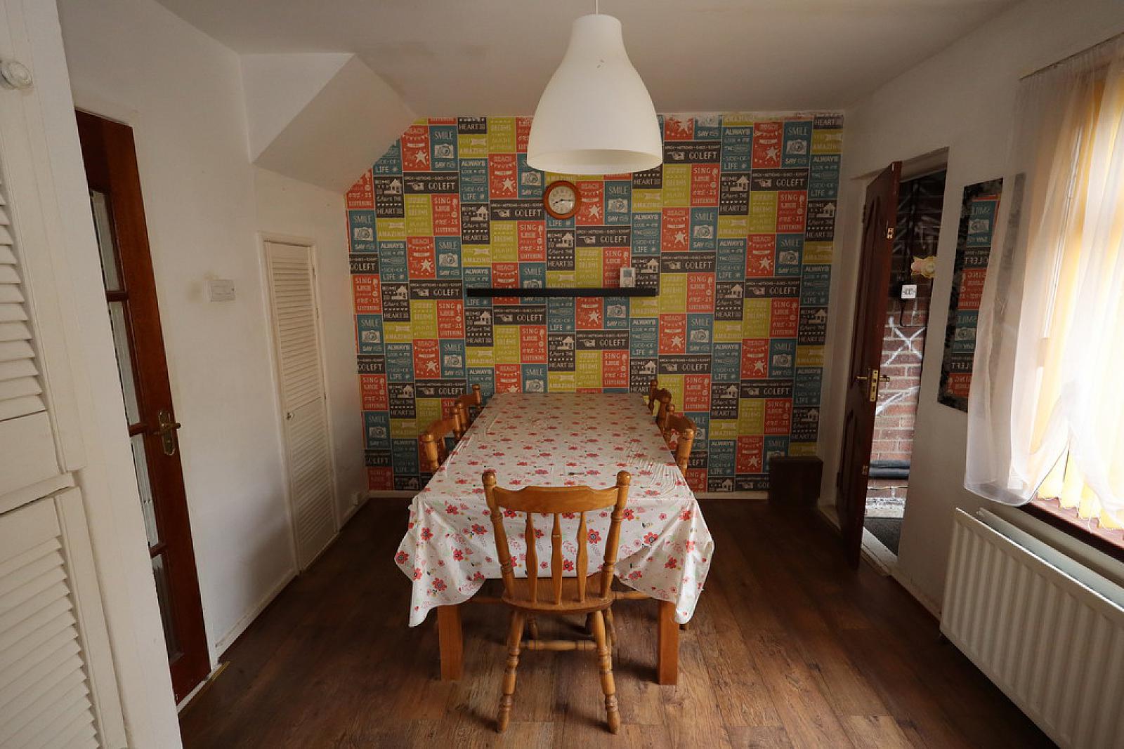 DINING AREA 9' 8" x 9' 6" (2.95m x 2.9m) Laminate wood floor. Under stair storage.