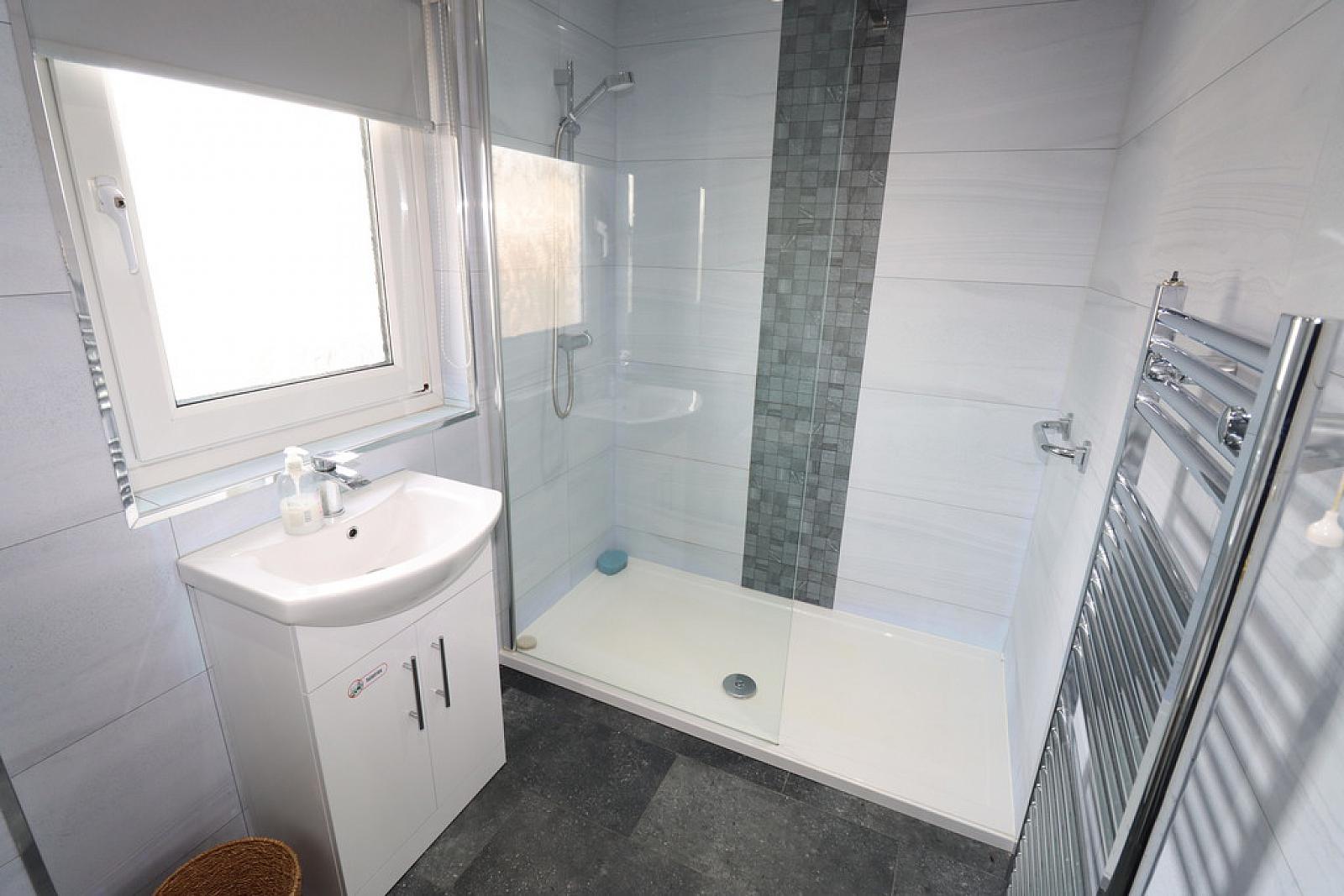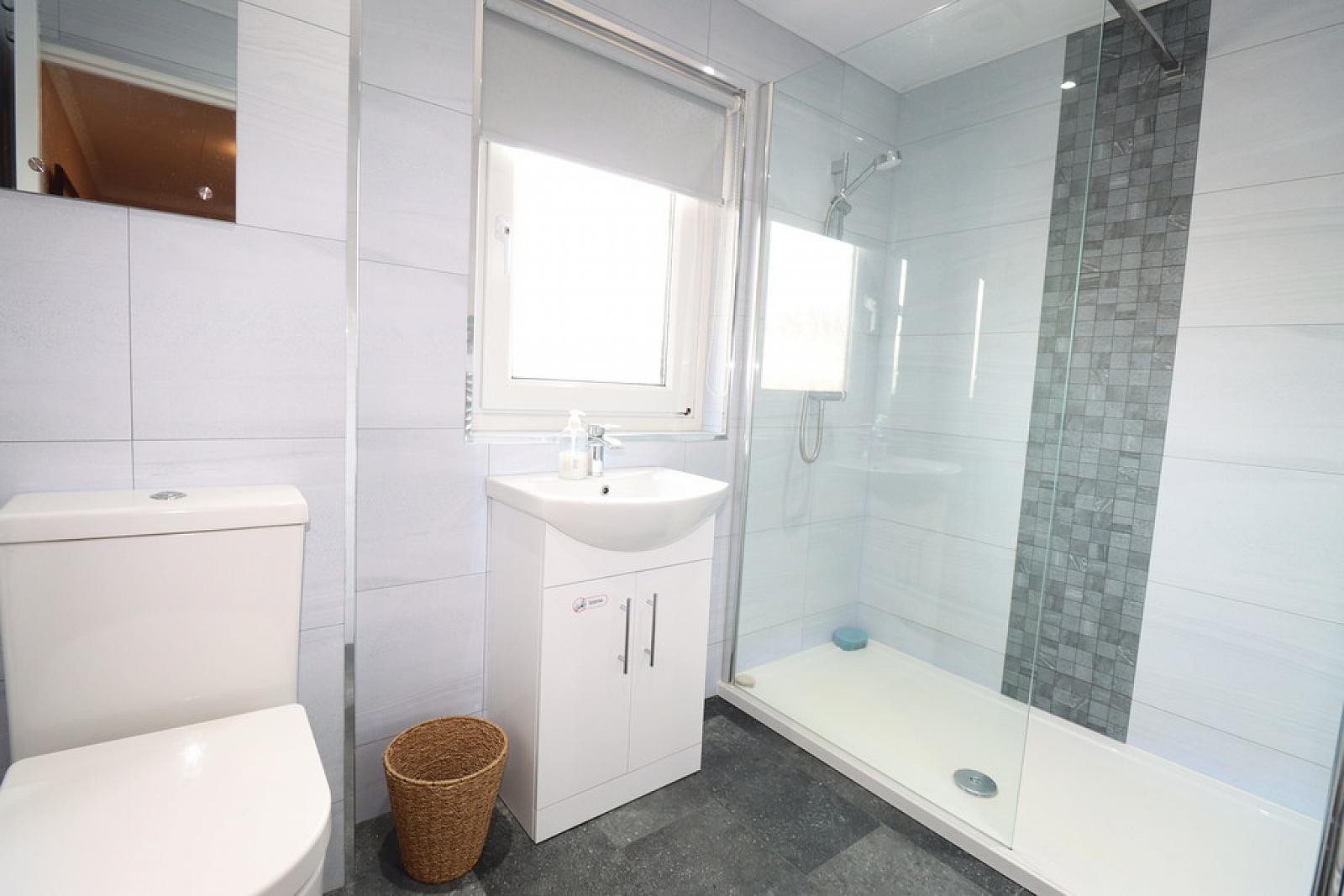 MODERN SHOWER ROOM Walk in shower unit, controlled shower, glazed shower screen, chrome heated towel rail, low flush W/C, LVT flooring, wall panelling, vanity sink unit with mixer taps, PVC panelled ceiling, extractor fan