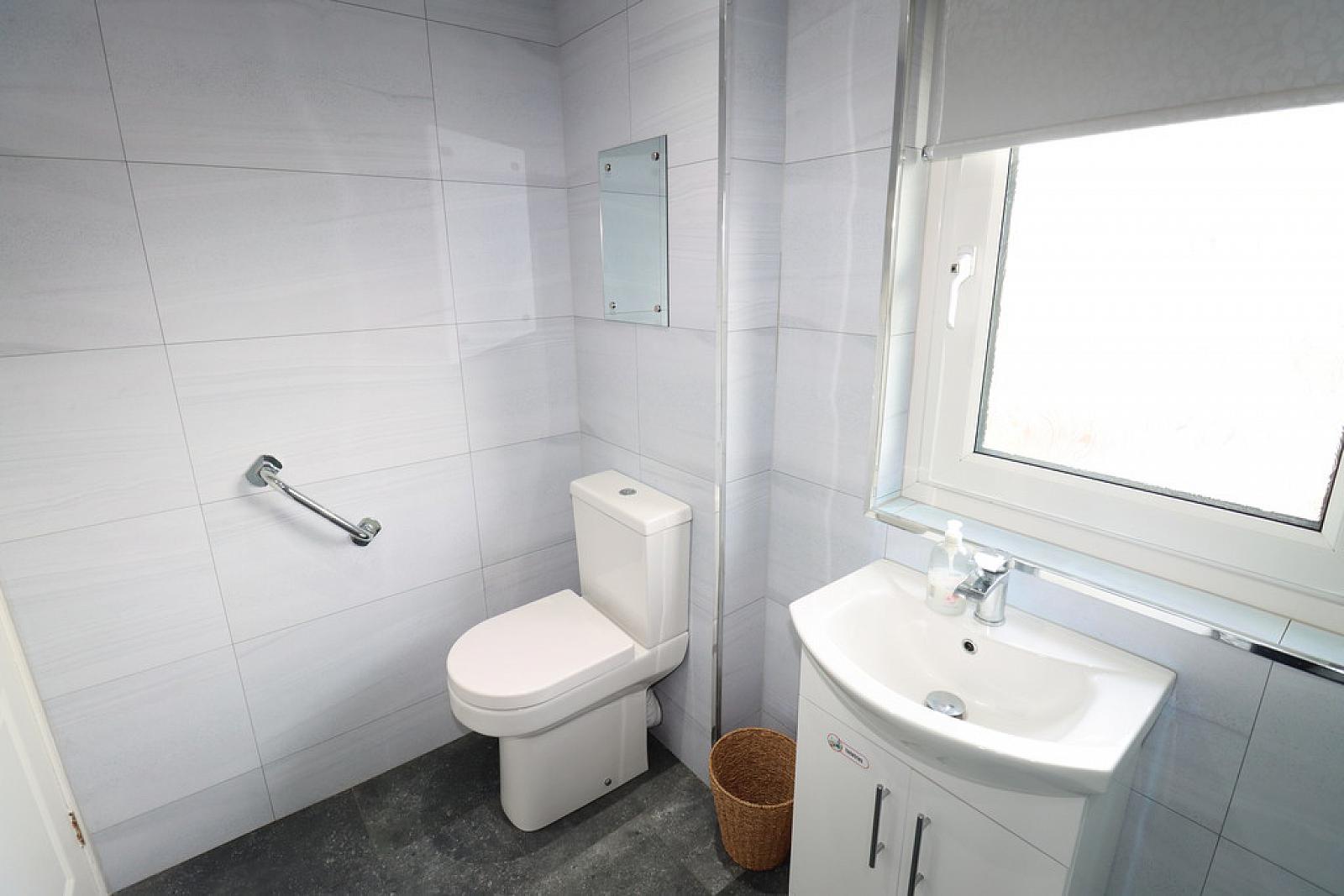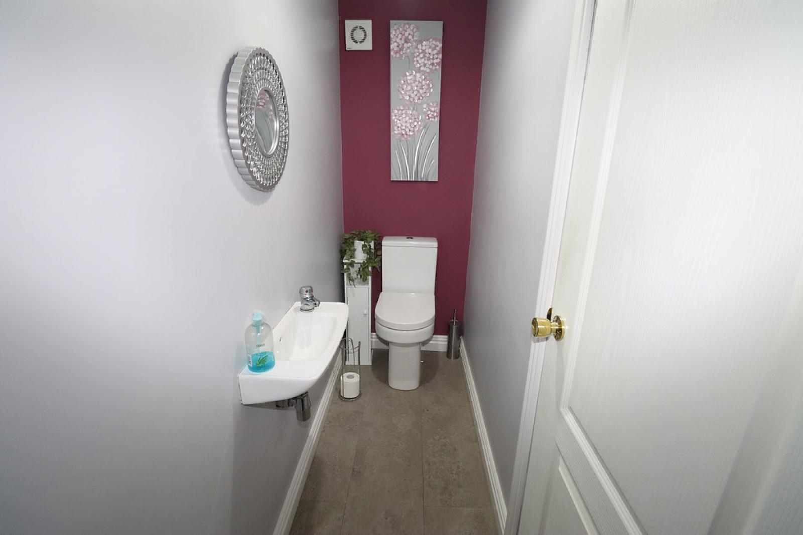 DOWNSTAIRS W/C Low flush W/C, hanging wash hand basin, extractor fan, understairs storage, LVT flooring