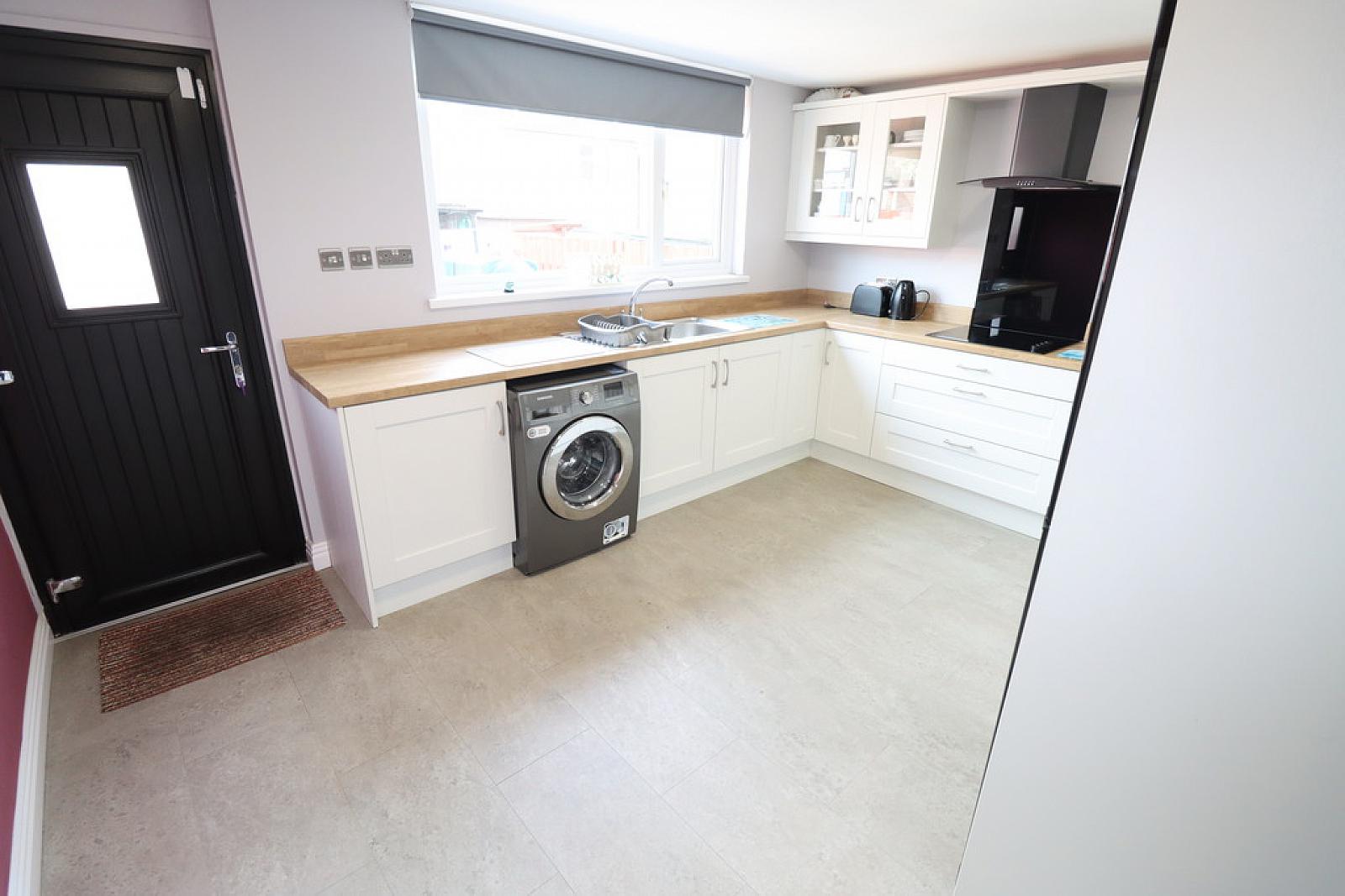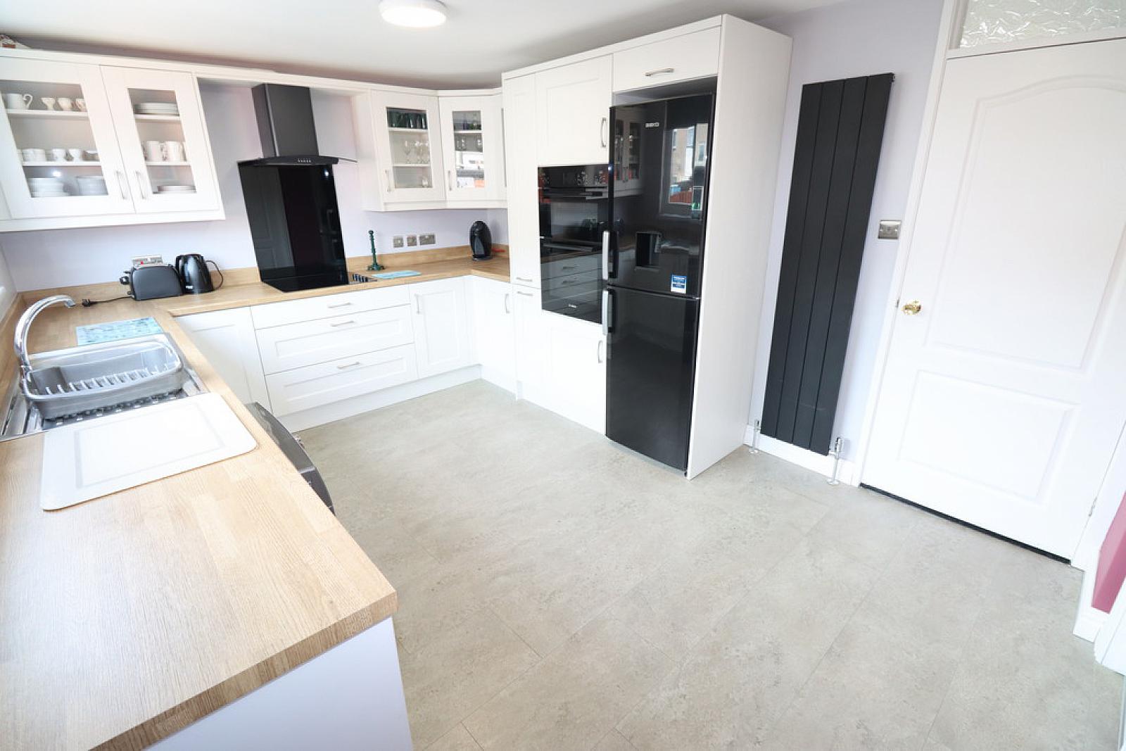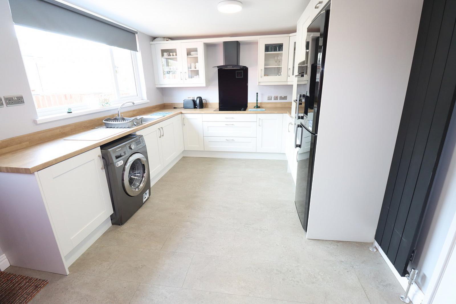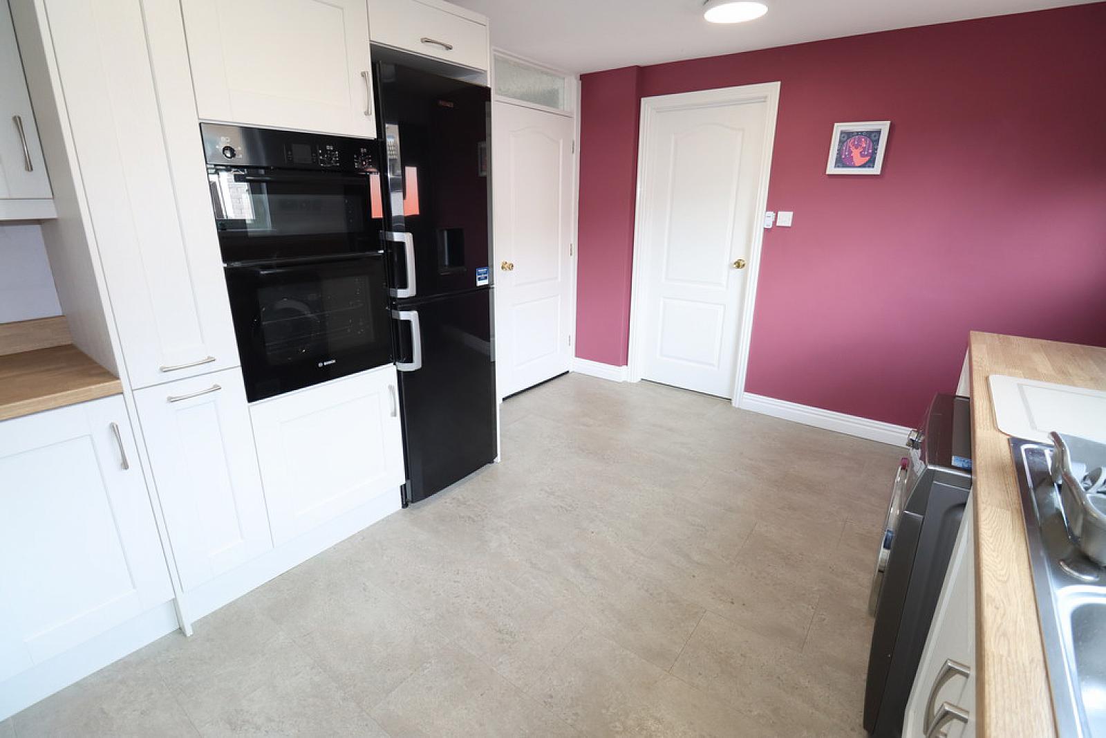 MODERN KITCHEN/DINING 14' 0" x 10' 2" (4.27m x 3.1m) Range of high and low level units, round edge worksurfaces, single drainer stainless steel sink unit with mixer taps, built in double stainless steel oven, stainless steel extractor fan, inlaid hob, glazed display cabinet, plumbed for washing machine, LVT flooring, vertical radiator, composite back door