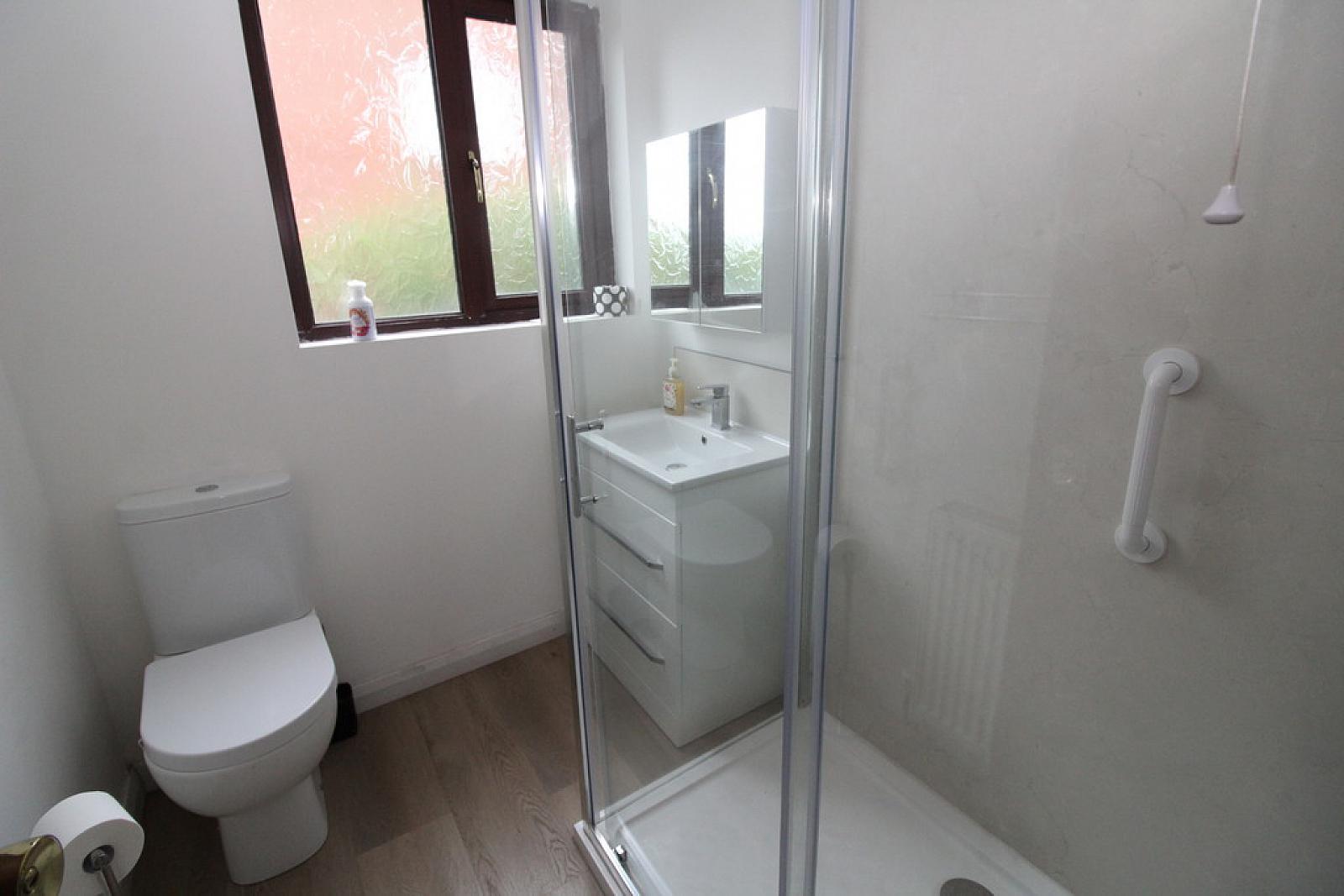 SHOWER ROOM Glazed shower cubicle with Redring electric shower, low flush W/C, vanity unit sink, laminate wood flooring