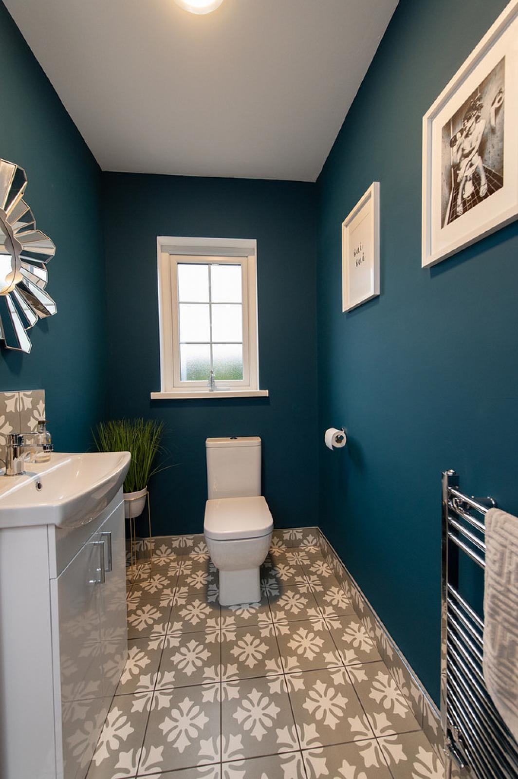 CLOAKS Low flush W/C, vanity unit, ceramic tiled flooring, understairs storage