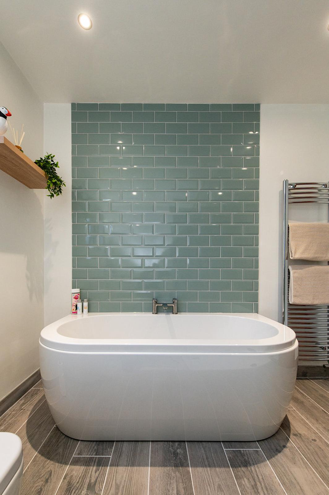BATHROOM White suite, feature bath, low flush W/C, vanity sink unit, overhead rain shower, extractor fan, downlighters, ceramic tiled flooring, heated towel rail