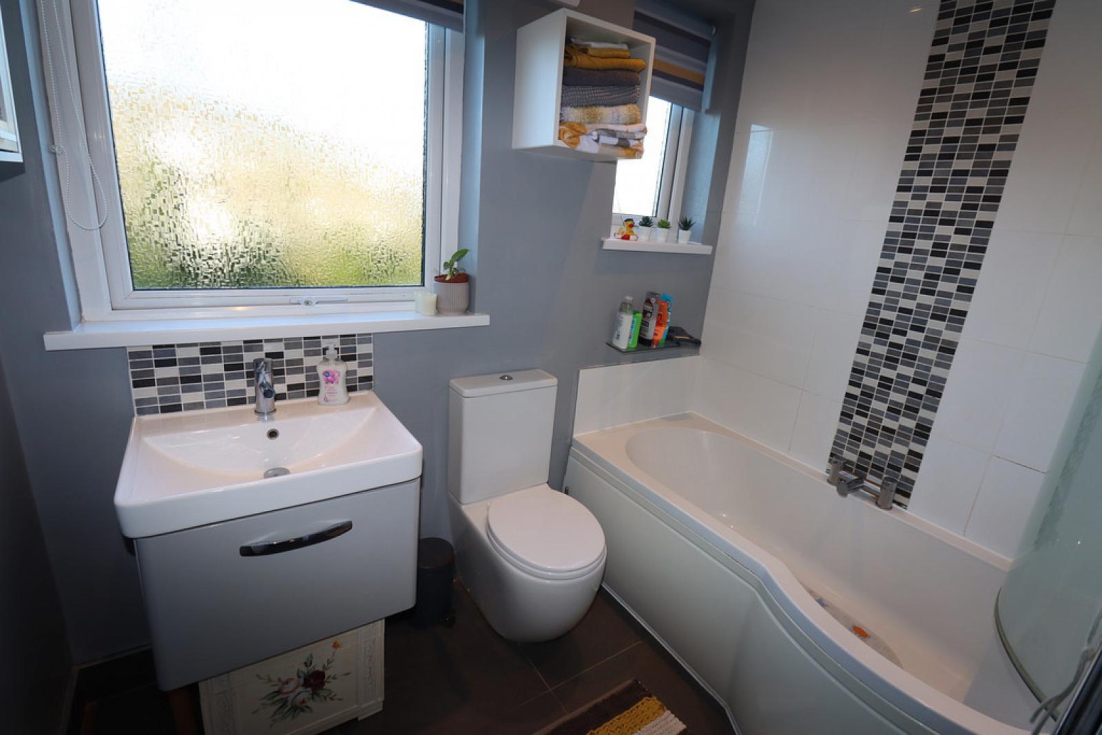 BATHROOM uPVC bath unit, electric shower, glazed shower screen, floating sink unit with mixer taps, low flush W/C, extractor fan, wall tiling, uPVC panelled ceiling, downlighters, chrome heated towel rail