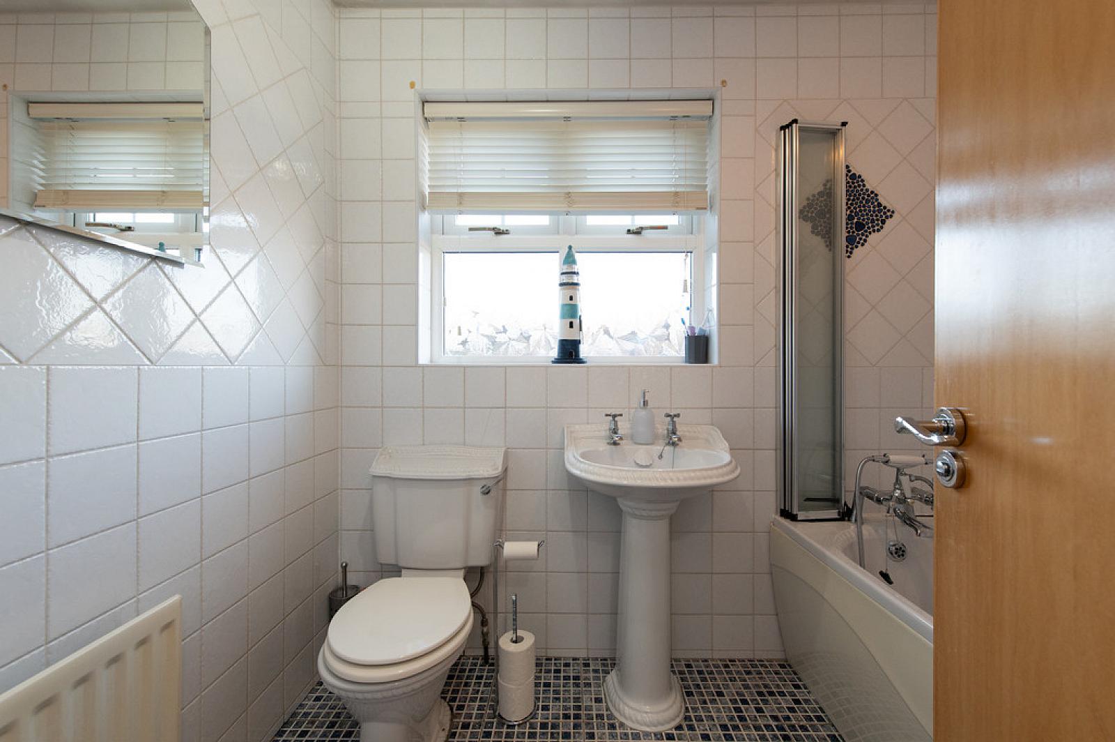 BATHROOM PVC bath unit, mixer taps, shower screen, low flush W/C, pedestal wash hand basin, wall tiling, ceramic tiled flooring