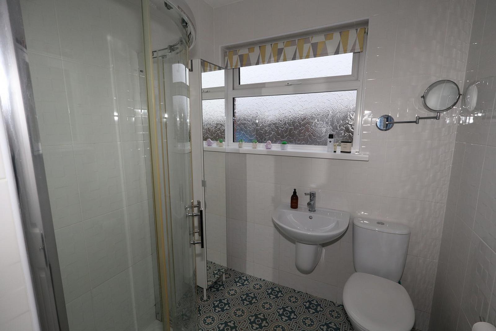 SHOWER ROOM Low flush W/C, wall hung wash hand basin, shower unit with electric shower, modern tiling, extractor fan, downlighters