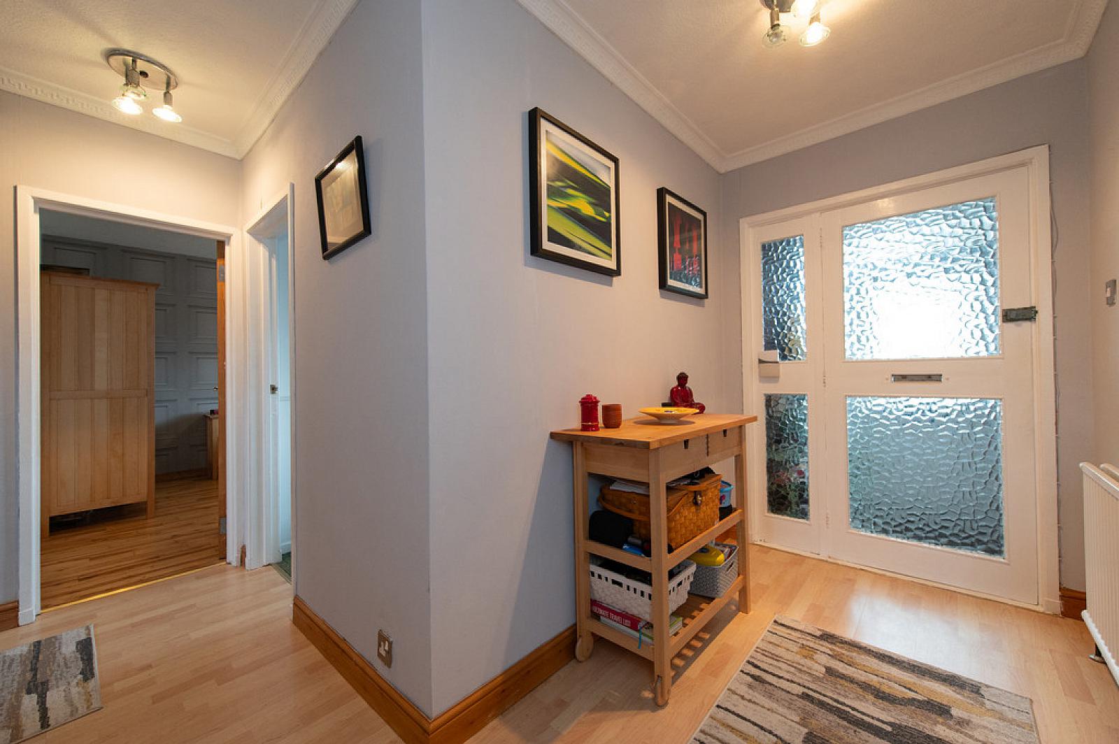 ENTRANCE HALL Laminate wood flooring, built in storage cupboard, separate storage with gas boiler, cornicing, access to partially floored roofspace with light and power