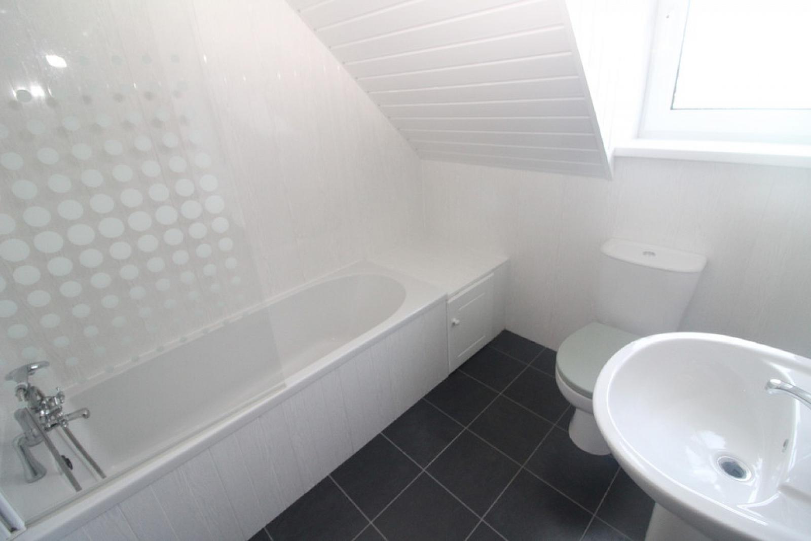 BATHROOM Modern white suite comprising panelled bath, glazed shower screen, shower, PVC panelled walls, ceramic tiled flooring