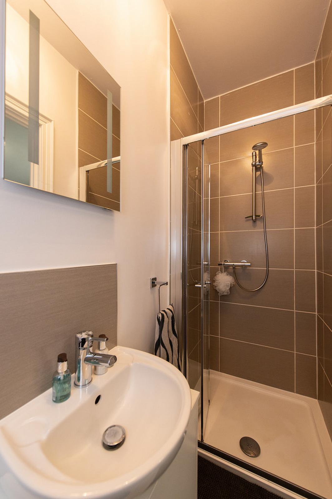 ENSUITE SHOWER ROOM Glazed shower cubicle with thermostatic controlled shower, low flush W/C, vanity unit sink, extractor fan, wall tiling and ceramic tiled flooring