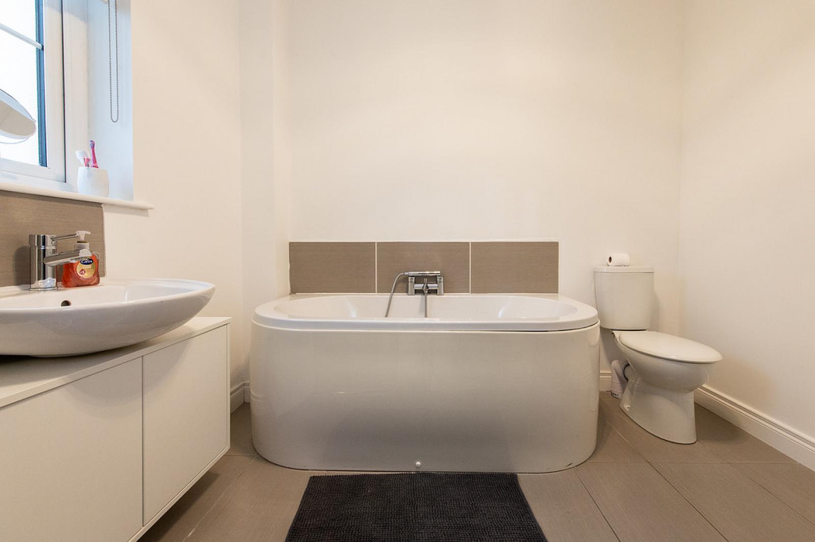 BATHROOM Modern white suite comprising panelled bath, telephone hand shower, low flush W/C, separate glazed shower cubicle with thermostatic controlled shower, chrome heated towel rail, wall tiling, ceramic tiled flooring, extractor fan