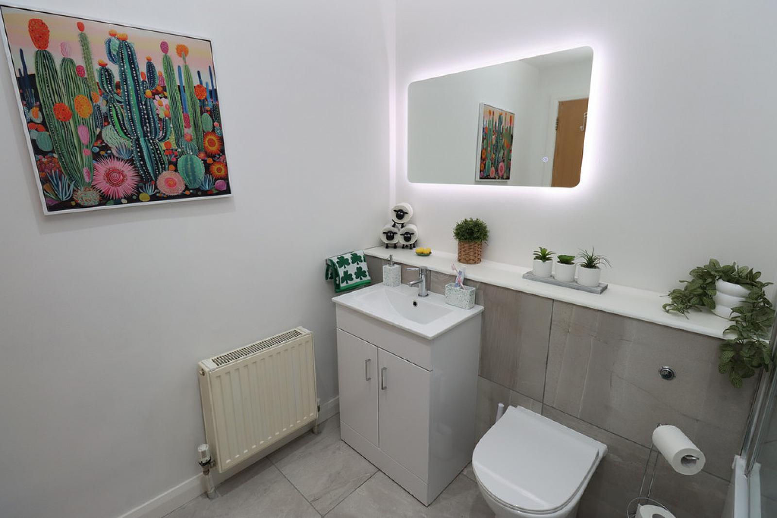 BATHROOM Modern three piece bathroom suite comprising panelled bath with overhead thermostatically controlled shower unit and rainfall shower head, push button WC, pedestal wash hand basin with under-bench storage. Downlighters, extractor fan, powered and lit mirror.