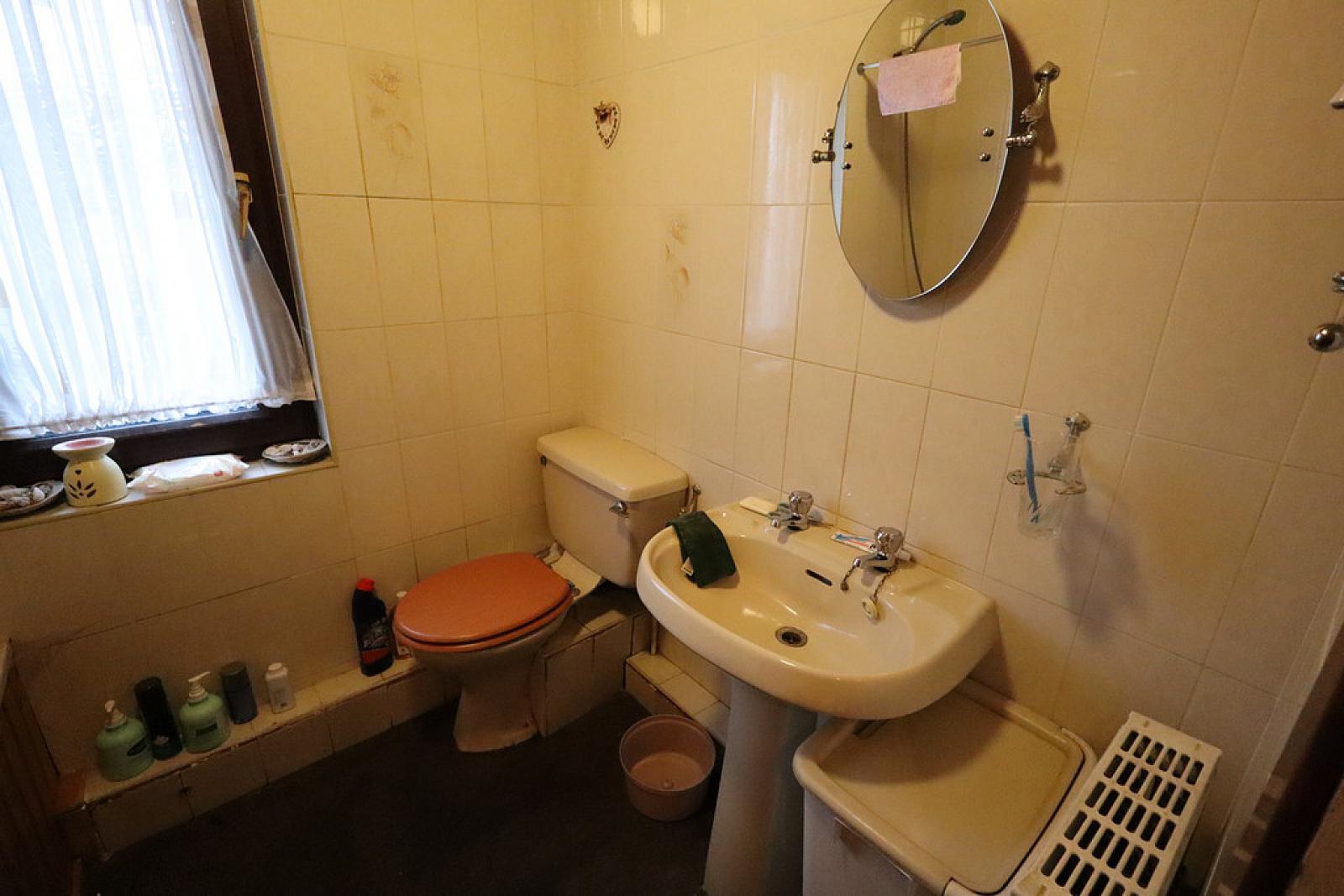 BATHROOM Panelled bath unit, controlled shower, low flush W/C, wall tiling, pedestal wash hand basin