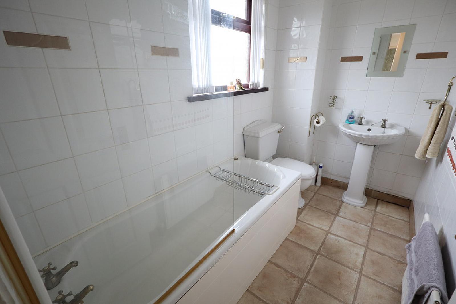 BATHROOM Wooden paneled bath unit, electric shower, glazed shower screen, low flush W/C, pedestal wash hand basin, wall tiling